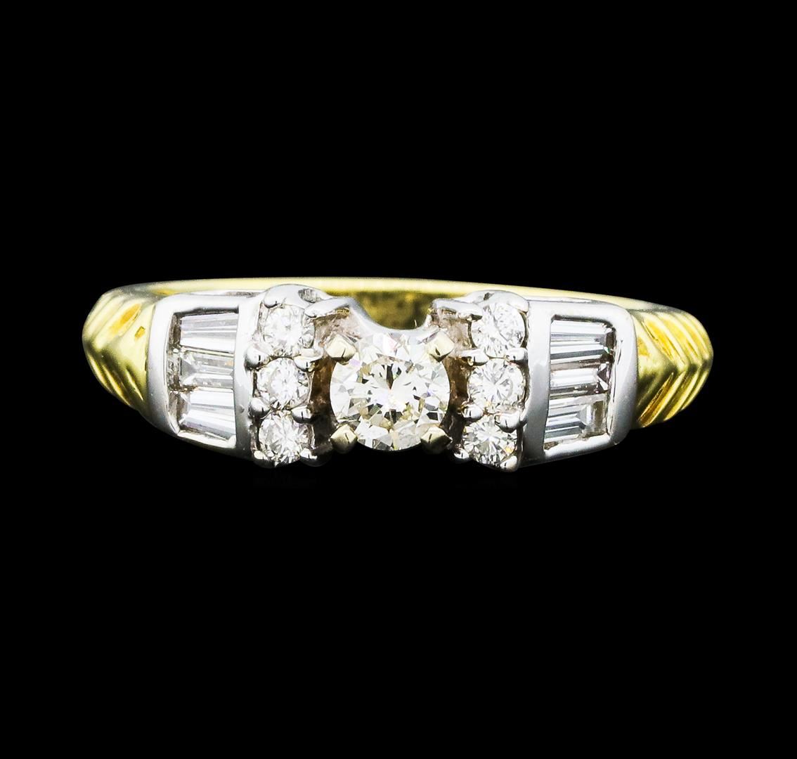 One electronically tested 14KT yellow and white gold lady's combination cast & assembled wedding ring with a tapered cathedral shank with a bright polished textured finish. The featured lady's ring has a shank measuring 2.12 millimeters wide. Identified with markings of '14K'. Condition is new, good workmanship. Containing: One prong set round brilliant cut diamond, measuring 3.91 - 3.87 x 2.41mm (depth est.) approximate weight of 0.22ct. Graded in the setting. Color I Clarity I-1 Cut Good Six prong set round brilliant cut diamonds, measuring 1.80 - 1.70 x 1.09mm (depth est.) approximate total weight of 6 Stones = 0.12ct. Graded in the setting. Color H - I Clarity SI-1 to SI-2 Cut Good Six channel set baguette cut (tapered) diamonds, measuring from 3.00 x 1.40 x 1.19mm (depth est.) to 3.20 x 1.50 x 1.28mm (depth est.) approximate total weight of 6 Stones = 0.30ct. Graded in the setting. Color H - I Clarity VS-1 to VS-2 Cut Very Good. Total Weight of Diamonds 0.64ct.. Total Weight of Ring 4.00gm GAS Appraised at $2490.00. GAS Appraised at $2,490.00.