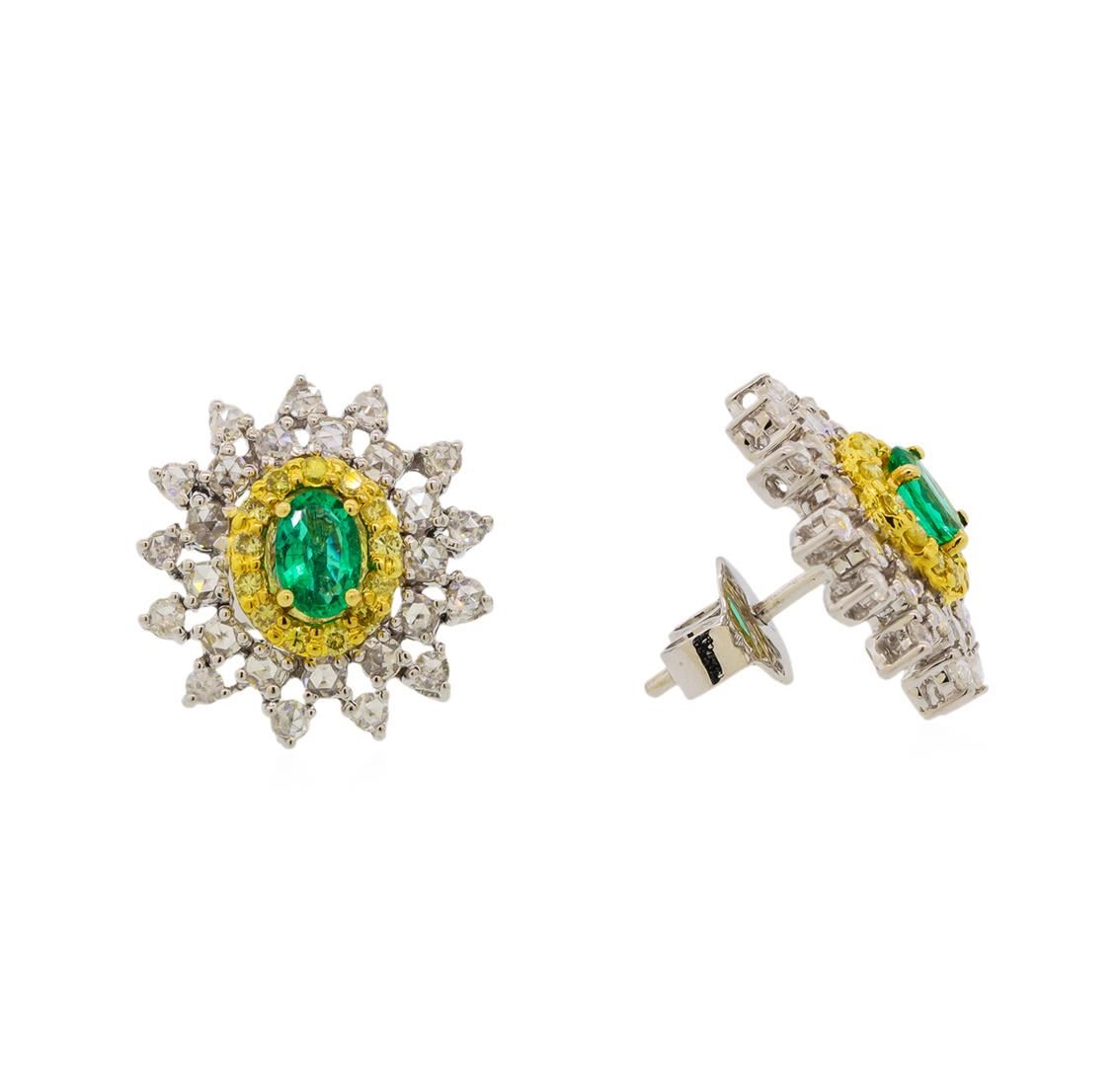 One pair electronically tested 18KT white and yellow gold lady's combination cast & assembled fashion earrings with heavy friction backs with a bright polish finish. Condition is new, good workmanship. Containing: Two prong set oval modified brilliant cut natural emeralds, measuring 5.78 x 3.95 x 2.45mm, (depth est.) approximate total weight of 0.64ct., clarity is slightly included, medium, moderately strong, green color, (GIA G 5/4), cut is good. Transmitting light with a minimum of distortion, transparent. Indications of oil residue. Colored gemstones are presumed to have been subjected to commonly used enhancement processes. Graded in the setting. Twenty-Six prong set rose cut diamonds, measuring 2.30 - 2.25 x 1.00mm (depth est.) approximate total weight of 26 Stones = 0.58ct. Graded in the setting. Clarity SI-1 to SI-2. Color: H - I Cut Good Twenty-Six prong set rose cut diamonds, measuring 2.00 - 1.90 x 0.90mm (depth est.) approximate total weight of 26 Stones = 0.38ct. Graded in the setting. Clarity SI-1 to SI-2. Color: H - I Cut Good Twenty-Six prong set round brilliant cut diamonds, measuring 1.60 - 1.50 x 0.96mm (depth est.) approximate total weight of 26 Stones = 0.38ct. Colored gemstones are presumed to have been subjected to commonly used enhancement processes. Graded in the setting. Clarity SI-1 to I-1 Cut Good. Total Weight of Colored Stones 0.64ct.. Total Weight of Diamonds 1.34ct.. Total Weight of Earrings 7.80gm. GAS Appraised at $4,755.00.