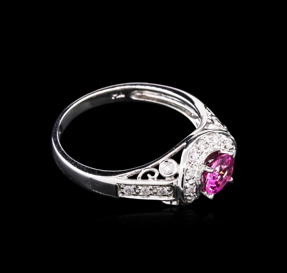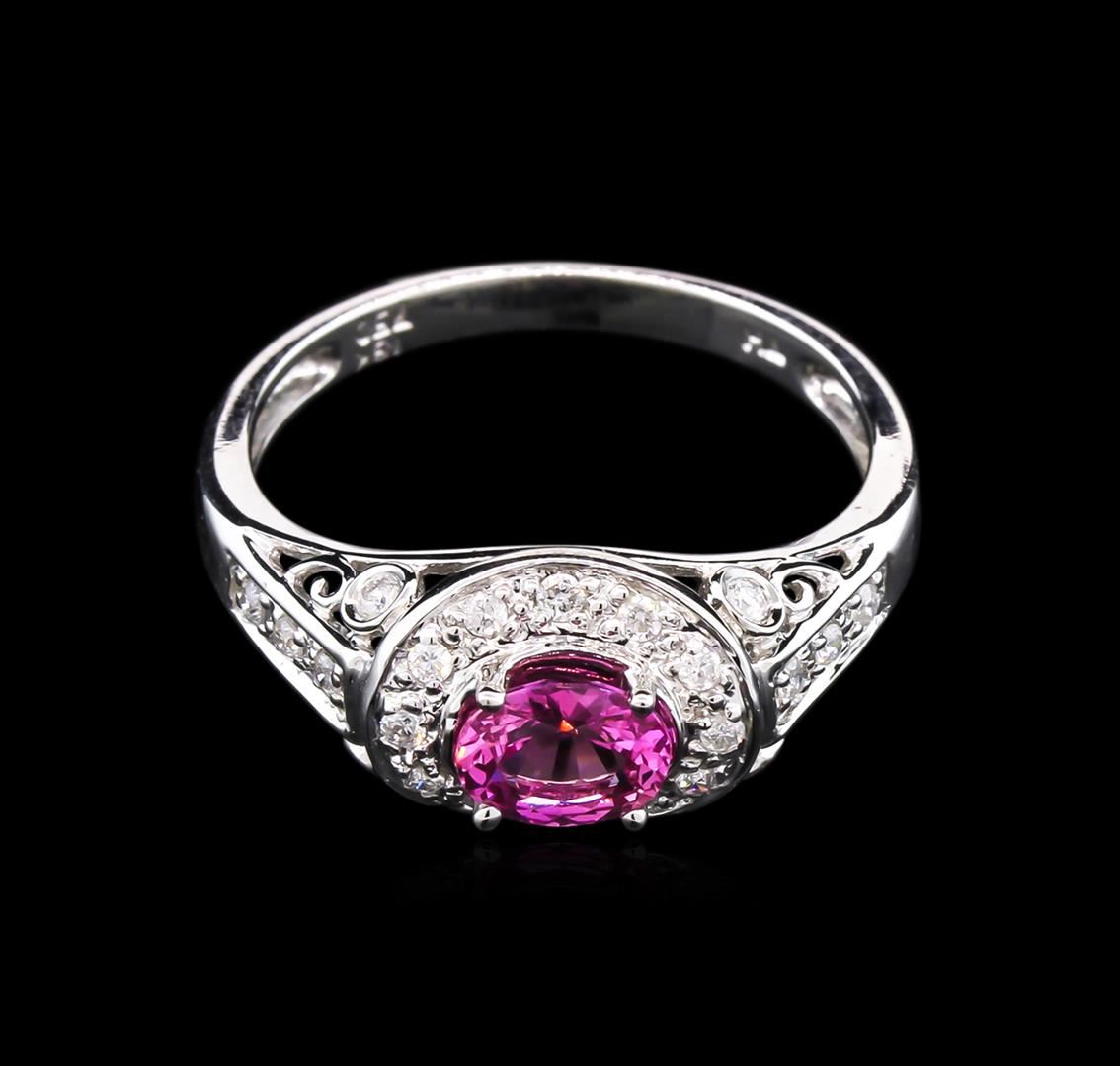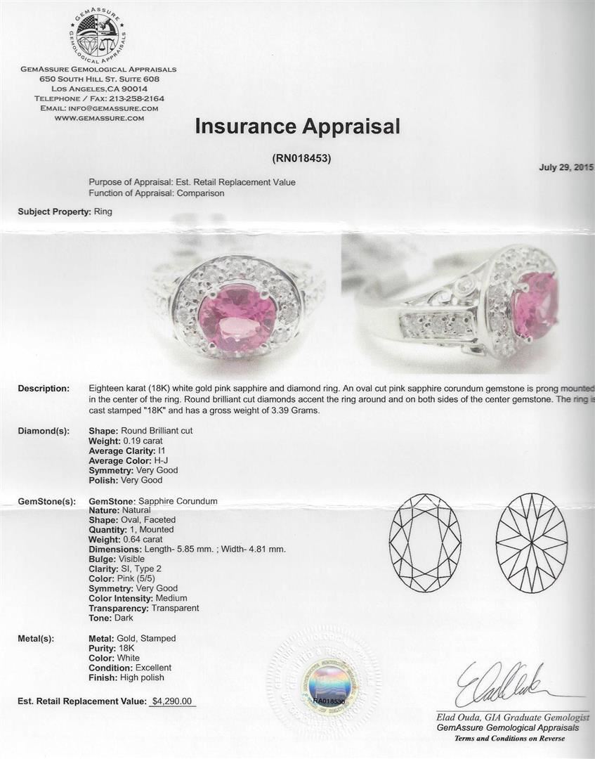 Eighteen karat (18K) white gold pink sapphire and diamond ring. An oval cut pink sapphire corundum gemstone is prong mounted in the center of the ring. Round brilliant cut diamonds accent the ring around and on both sides of the center gemstone. The ring is cast stamped "18K" and has a gross weight of 3.39 Grams. Diamond(s): Shape: Round Brilliant cut. Weight: 0.19 carat. Average Clarity: I1. Average Color: H-J. Symmetry: Very Good. Polish: Very Good. Gemstone(s): Gemstone: Sapphire Corundum. Nature: Natural. Shape: Oval, Faceted. Quantity: 1, Mounted. Weight: 0.64 carat. Dimensions: Length- 5.85 mm. ; Width- 4.81 mm. Bulge: Visible. Clarity: SI, Type 2. Color: Pink (5/5). Symmetry: Very Good. Color Intensity: Medium. Transparency: Transparent. Tone: Dark. Metal(s): Metal: Gold, Stamped. Purity: 18K. Color: White. Condition: Excellent. Finish: High polish. GGA Appraised at $4,290.00.