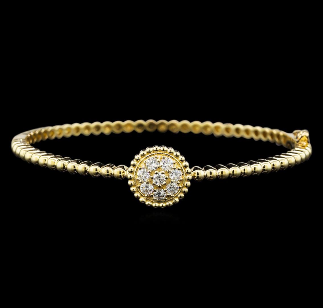 One electronically tested 14KT yellow gold lady's combination cast & assembled fashion bangle bracelet with a tongue clasp with foldover safety with a bright polish finish. The featured lady's bangle bracelet has a straight line scalloped motif and measures approximately 7 inches in length. Identified with markings of 'K14'. Condition is new, good workmanship. Containing: Eight prong set round brilliant cut diamonds, measuring 2.80 - 2.75 x 1.72mm (depth est.) approximate total weight of 8 Stones = 0.65ct. Graded in the setting. Clarity SI-1 to I-1. Color: H - I Cut Good. Total Weight of Diamonds 0.65ct.. Total Weight of Bangle Bracelet 13.60gm. GAS Appraised at $3,705.00.