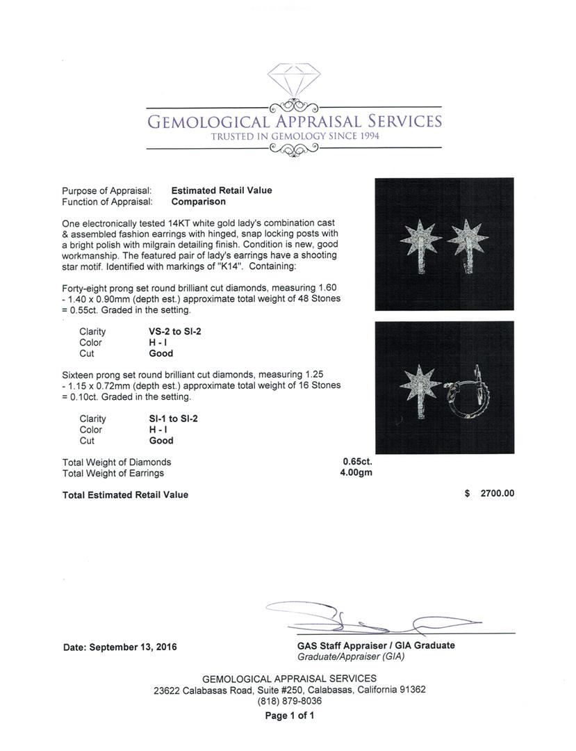 One Pair electronically tested 14KT white gold lady's combination cast & assembled fashion earrings with hinged, snap locking posts with a bright polish with milgrain detailing finish. The featured Pairof lady's earrings have a shooting star motif. Identified with markings of 'K14'. Condition is new, good workmanship. Containing: Forty-Eight prong set round brilliant cut diamonds, measuring 1.60 - 1.40 x 0.90mm (depth est.) approximate total weight of 48 Stones = 0.55ct. Graded in the setting. Clarity VS-2 to SI-2. Color: H - I Cut Good Sixteen prong set round brilliant cut diamonds, measuring 1.25 - 1.15 x 0.72mm (depth est.) approximate total weight of 16 Stones = 0.10 ct. Graded in the setting. Clarity SI-1 to SI-2. Color: H - I Cut Good. Total Weight of Diamonds 0.65ct.. Total Weight of Earrings 4.00gm GAS Appraised.