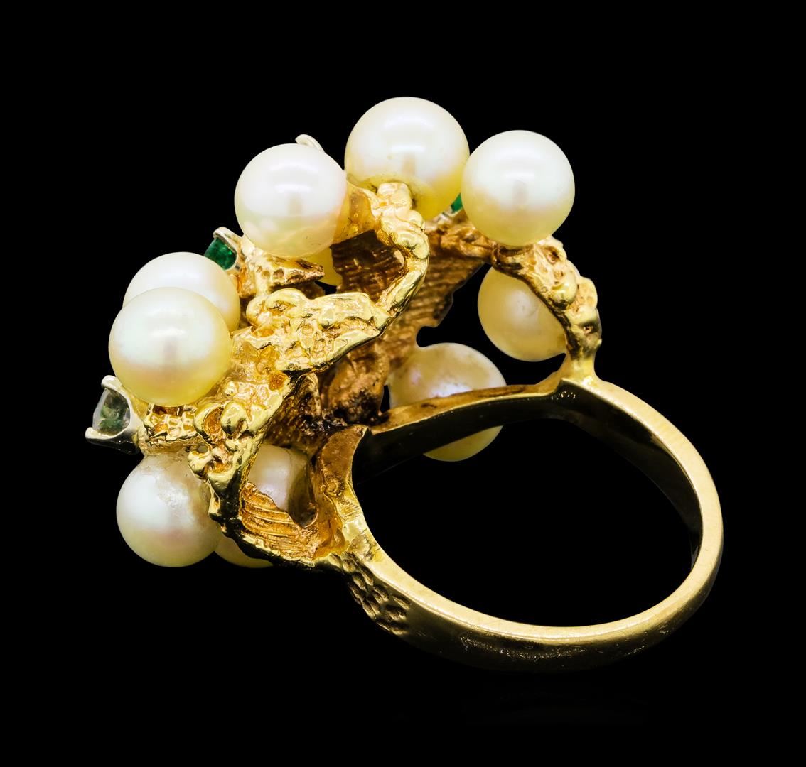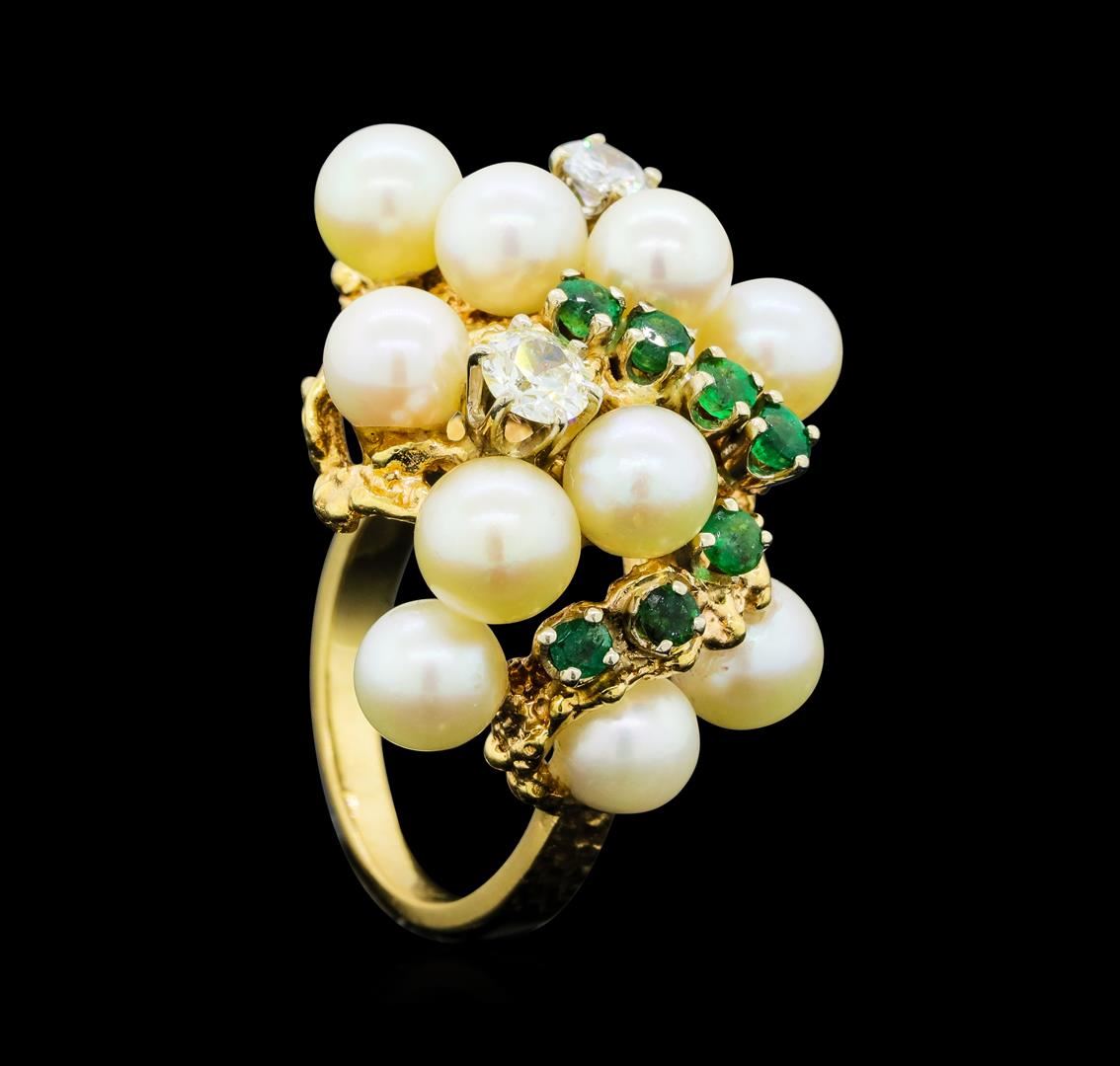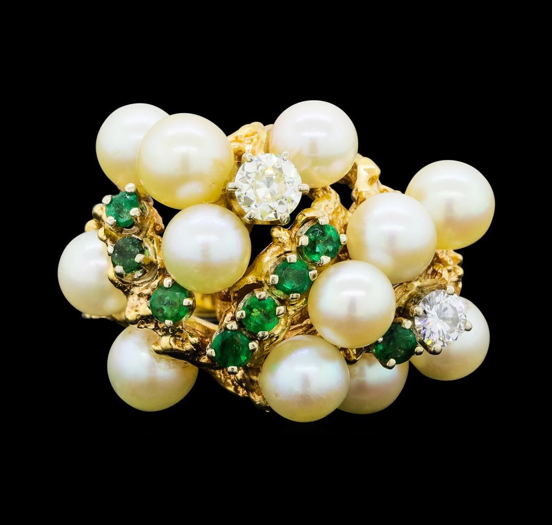 One lady's ring featuring: 14KT yellow gold weighing 16.4 grams containing diamonds weighing approximately 0.65ctw, emeralds weighing approximately 0.60ct and twelve pearls measuring 6.5-7mm.