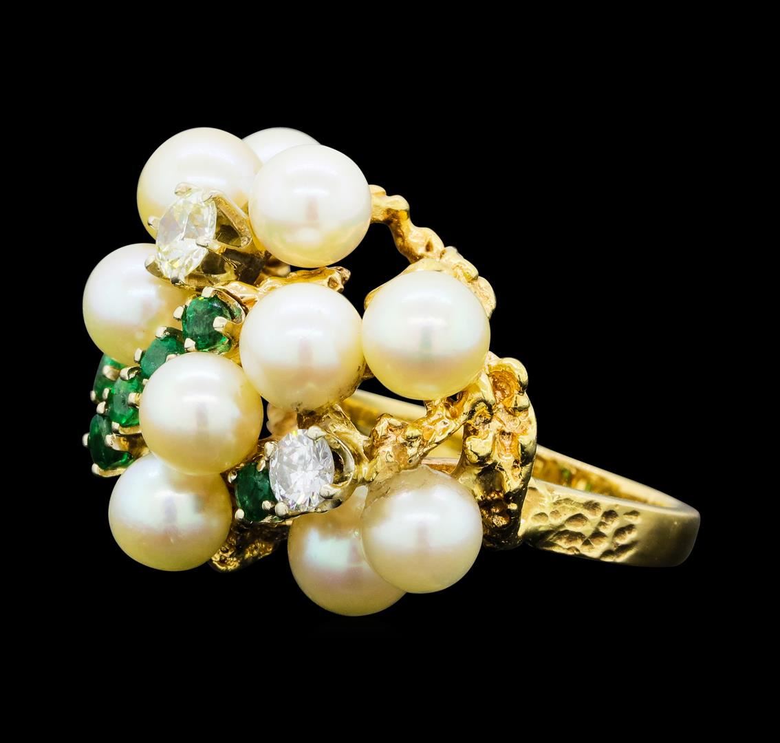One lady's ring featuring: 14KT yellow gold weighing 16.4 grams containing diamonds weighing approximately 0.65ctw, emeralds weighing approximately 0.60ct and twelve pearls measuring 6.5-7mm.