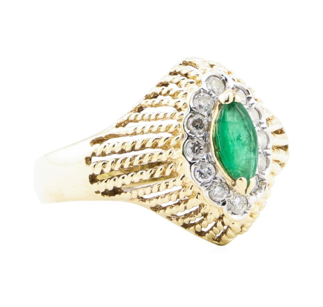 One electronically tested 14KT yellow and white gold lady's combination cast & assembled fashion halo ring with a chevron cathedral motif with a bright polish finish. The featured lady's ring has a twisted wire motif and a shank measuring 2.70 millimeters in width. Identified with markings of '14K 585'. Condition is Good. Containing: One prong set marquise modified brilliant cut natural emerald, measuring 7.80 x 3.50 x 2.32mm, (depth est.) 5%. bulge factor, approximate weight of 0.35ct., clarity is heavily included, medium, moderately strong, green color, (GIA G 5/4), cut is good. Colored gemstones are presumed to have been subjected to commonly used enhancement processes. Indications of oil residue. Transmitting light somewhat diffusely, semi-transparent to translucent. Graded in the setting. Twelve prong set round brilliant cut diamonds, measuring 1.90 - 1.85 x 1.17mm (depth est.) approximate total weight of 12 Stones = 0.30 ct. Graded in the setting. Color H - I Clarity SI-1 to SI-2 Cut Good. Total Weight of Colored Stones 0.35ct.. Total Weight of Diamonds 0.30 ct.. Total Weight of Ring 3.70gm GAS Appraised at $1800.00. GAS Appraised.