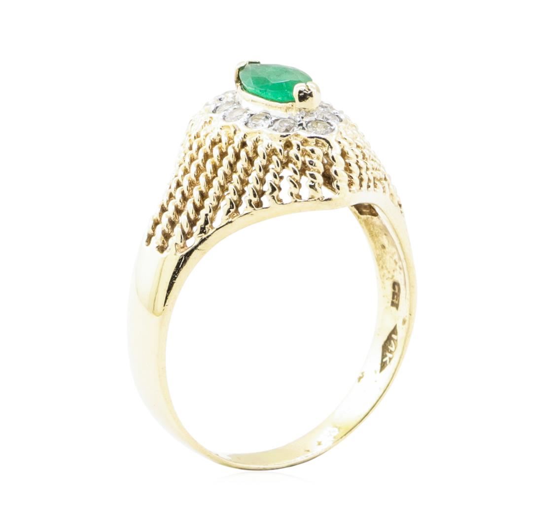 One electronically tested 14KT yellow and white gold lady's combination cast & assembled fashion halo ring with a chevron cathedral motif with a bright polish finish. The featured lady's ring has a twisted wire motif and a shank measuring 2.70 millimeters in width. Identified with markings of '14K 585'. Condition is Good. Containing: One prong set marquise modified brilliant cut natural emerald, measuring 7.80 x 3.50 x 2.32mm, (depth est.) 5%. bulge factor, approximate weight of 0.35ct., clarity is heavily included, medium, moderately strong, green color, (GIA G 5/4), cut is good. Colored gemstones are presumed to have been subjected to commonly used enhancement processes. Indications of oil residue. Transmitting light somewhat diffusely, semi-transparent to translucent. Graded in the setting. Twelve prong set round brilliant cut diamonds, measuring 1.90 - 1.85 x 1.17mm (depth est.) approximate total weight of 12 Stones = 0.30 ct. Graded in the setting. Color H - I Clarity SI-1 to SI-2 Cut Good. Total Weight of Colored Stones 0.35ct.. Total Weight of Diamonds 0.30 ct.. Total Weight of Ring 3.70gm GAS Appraised at $1800.00. GAS Appraised.