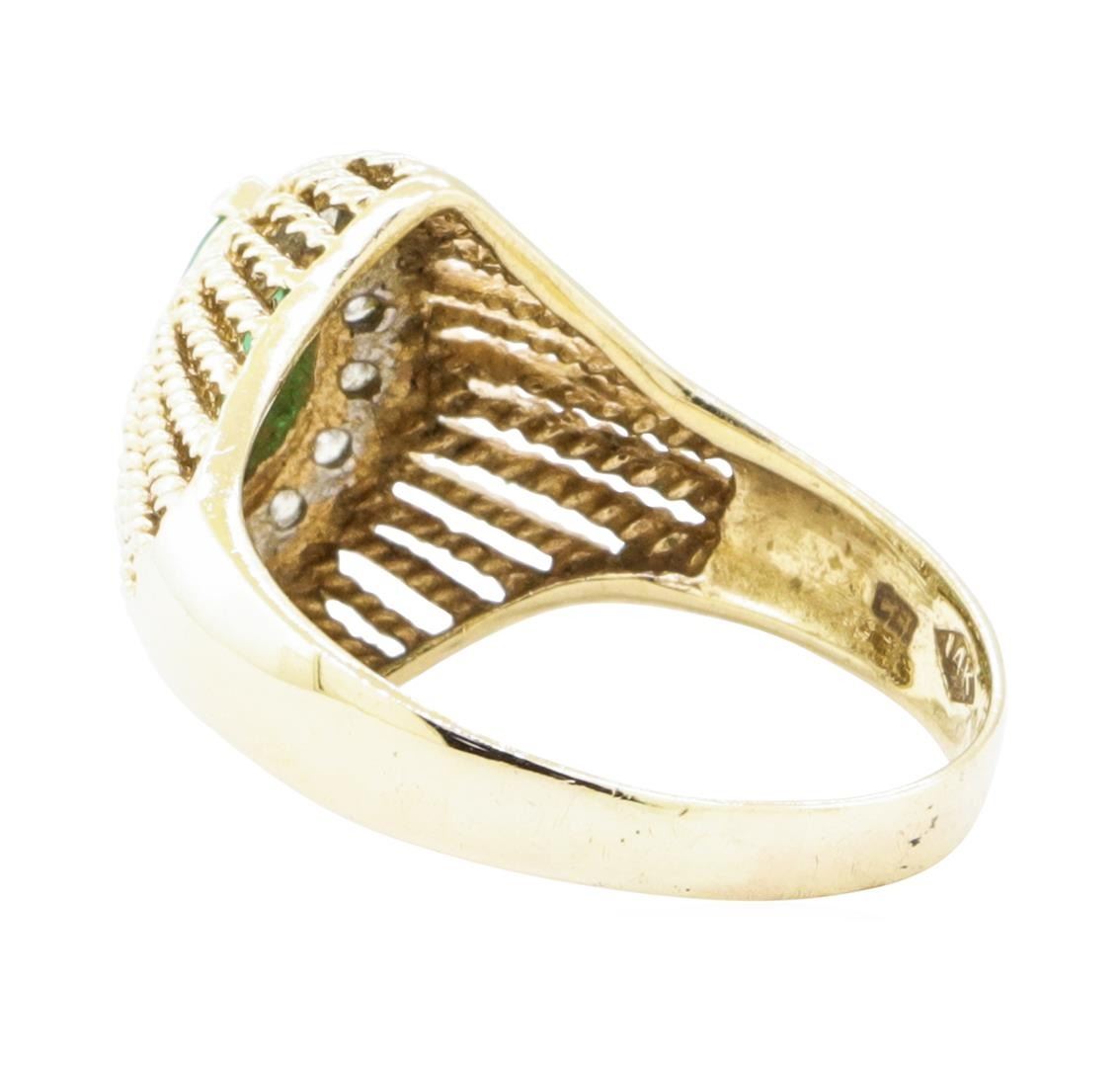 One electronically tested 14KT yellow and white gold lady's combination cast & assembled fashion halo ring with a chevron cathedral motif with a bright polish finish. The featured lady's ring has a twisted wire motif and a shank measuring 2.70 millimeters in width. Identified with markings of '14K 585'. Condition is Good. Containing: One prong set marquise modified brilliant cut natural emerald, measuring 7.80 x 3.50 x 2.32mm, (depth est.) 5%. bulge factor, approximate weight of 0.35ct., clarity is heavily included, medium, moderately strong, green color, (GIA G 5/4), cut is good. Colored gemstones are presumed to have been subjected to commonly used enhancement processes. Indications of oil residue. Transmitting light somewhat diffusely, semi-transparent to translucent. Graded in the setting. Twelve prong set round brilliant cut diamonds, measuring 1.90 - 1.85 x 1.17mm (depth est.) approximate total weight of 12 Stones = 0.30 ct. Graded in the setting. Color H - I Clarity SI-1 to SI-2 Cut Good. Total Weight of Colored Stones 0.35ct.. Total Weight of Diamonds 0.30 ct.. Total Weight of Ring 3.70gm GAS Appraised at $1800.00. GAS Appraised.