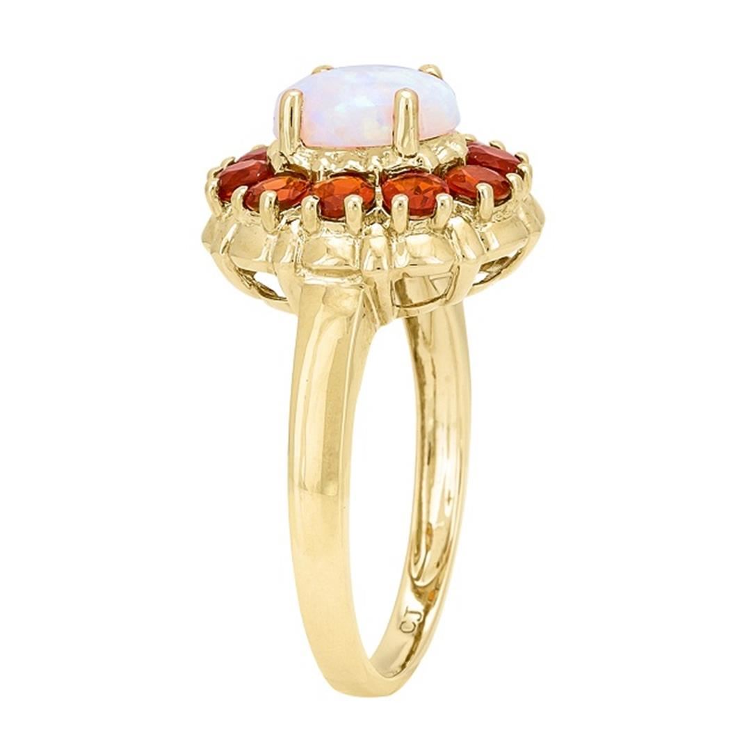One Australian Opal and Fire Opal Ring featuring: 14KT Yellow Gold with a total weight of 3.16 grams, Australian Opal with a total weight of 0.65ct and 10 Fire Opal Stones with a total weight of 0.75ctw.