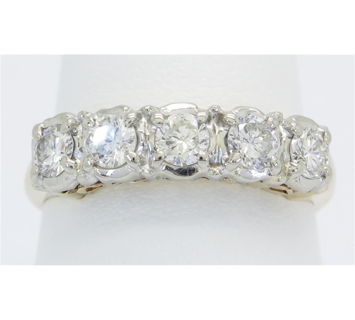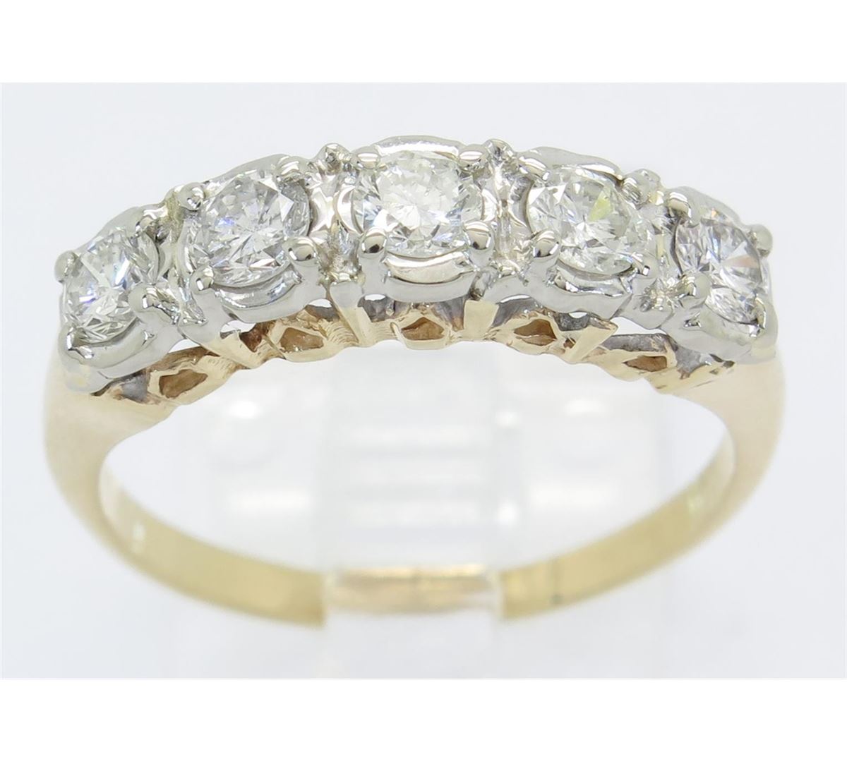 One tested 14K gold diamond ring. Containing: 5 Round Brilliant Cut Diamonds. Clarity: I-SI. Color: G-I. Approximate total diamond weight: .65CTW. Diamonds are graded in the mounting, unless otherwise stated. Weight: 3.1 grams. Size: 7.00