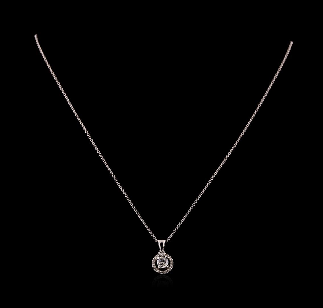 One electronically tested 14KT white gold lady's combination cast & assembled fashion pendant & chain 18.0' long, 1.3mm round cable link with a lobster claw clasp with a halo with a bright polish finish. Identified with markings of '14K'. Condition is new, good workmanship. Containing: One prong set round brilliant cut diamond, measuring 5.08 - 5.06 x 3.30mm (depth est.) approximate weight of 0.52ct. Graded in the setting. Clarity I-1. Color: G Cut Very Good Twenty prong set round brilliant cut diamonds, measuring 1.30 - 1.20 x 0.75mm (depth est.) approximate total weight of 20 Stones = 0.14ct. Graded in the setting. Clarity SI-1 to SI-2. Color: H - I Cut Good. Total Weight of Diamonds 0.66ct.. Total Weight of Pendant & Chain 3.40gm. GAS Appraised at $4,000.00.