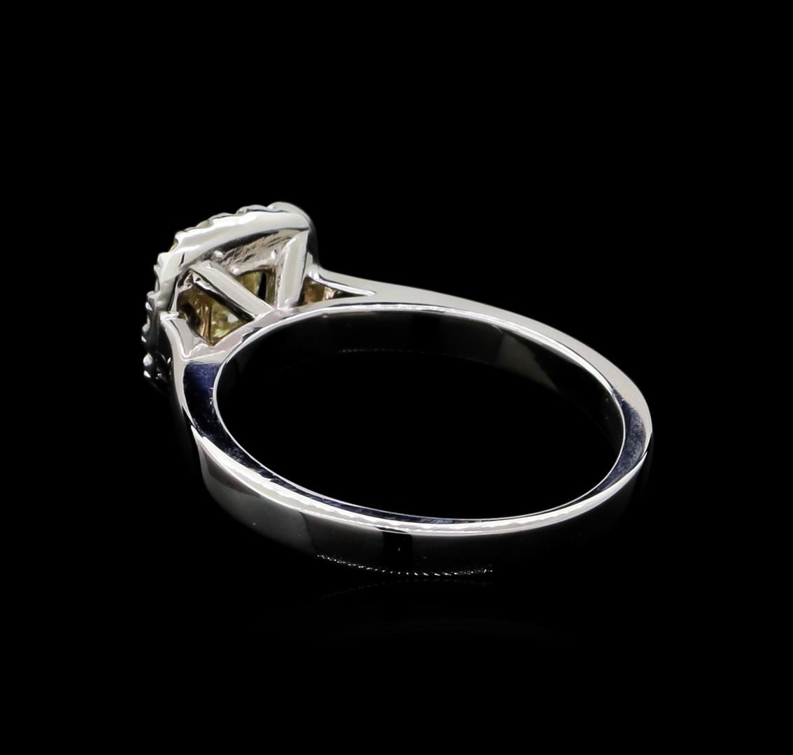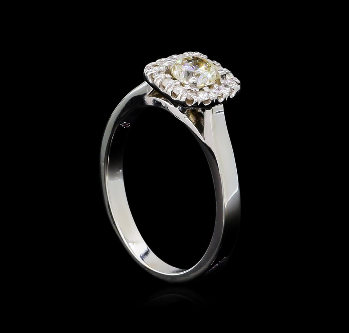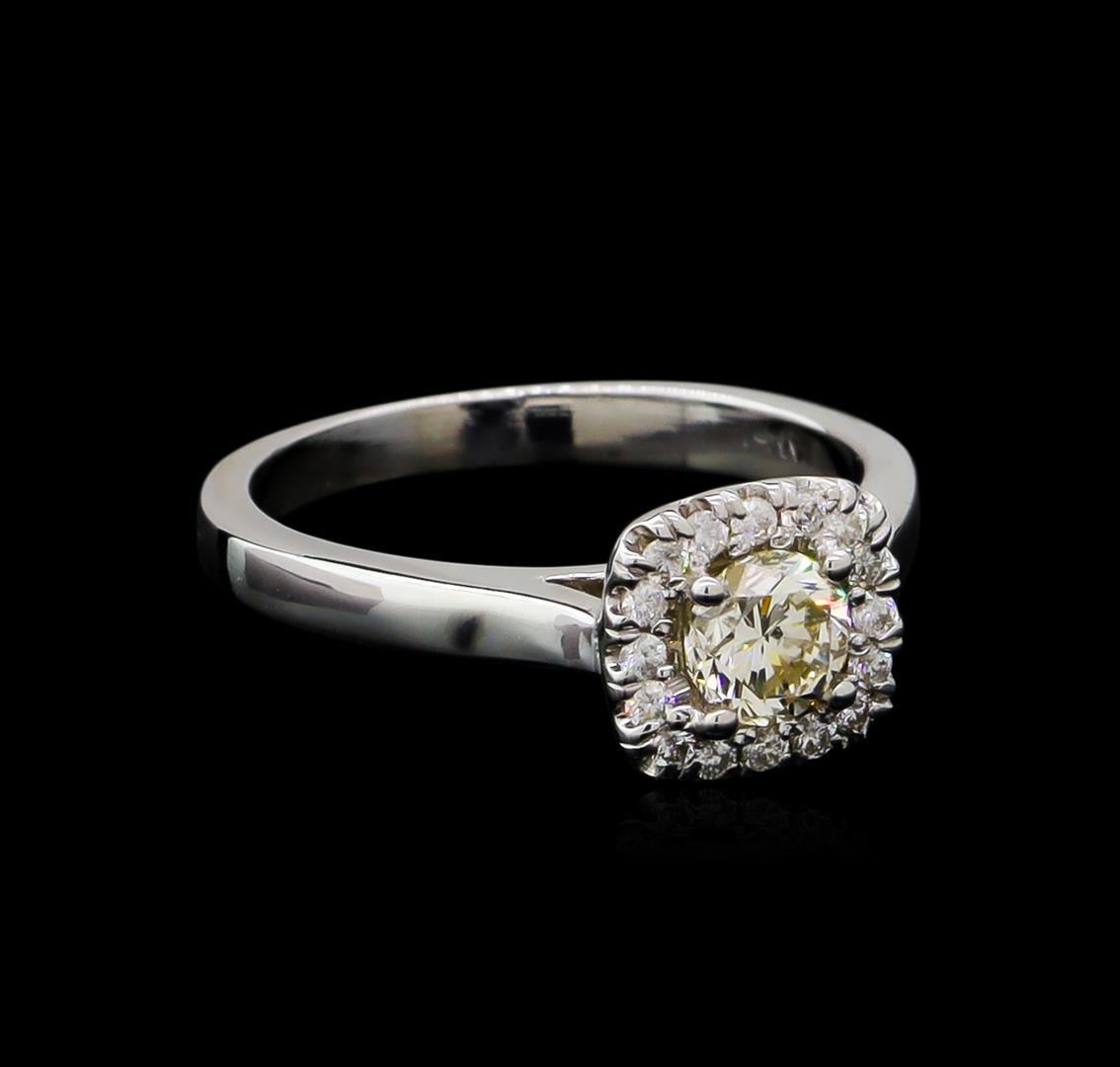 One electronically tested 14KT white gold ladies cast diamond unity ring with a bright polish finish. The featured diamond is set within a diamond bezel, completed by a two millimeter wide band. Identified with markings of "14K". Condition is new, good workmanship. Containing: One prong set round brilliant cut diamond, measuring 4.80 - 4.75 x 3.20mm (depth est.) approximate weight of 0.50ct with a strong blue fluorescence. Secondary brown color throughout. Graded in the setting. Clarity: I-1. Color: M. Depth 67.0%. Table 67.0%. Sixteen prong set round brilliant cut diamonds approximate total weight of 16 Stones = 0.16ct. Graded in the setting. Clarity: SI-2 to I-2. Color: G - I. Total Weight of Diamonds 0.66ct. Total Weight of Ring 3.58gm. AIG Appraised at $2,545.00.