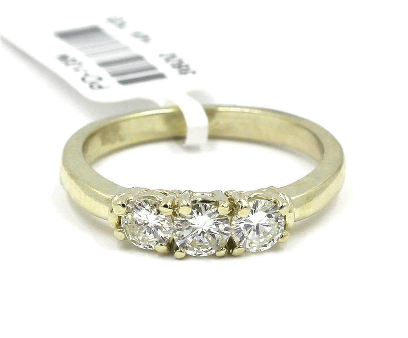 One three stone ring featuring: 14KT white gold weighing 3.12 grams containing three diamonds weighing 0.66ctw. The diamonds are round brilliant cut and are natural, unenhanced stones with SI1 clarity and H-I color. The ring is a size 6 but is resizable.