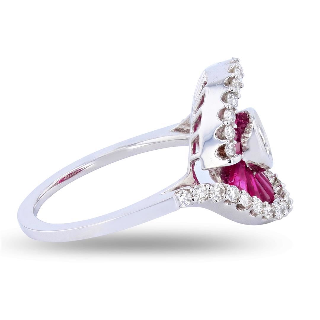 One polished, stamped, and tested 14K white gold ring with a bright finish. The ring is mounted with: 32 genuine round diamonds weighing approximately 0.66 carats and 16 genuine faceted rubies weighing approximately 2.55 carats. This item weighs 5.6 grams