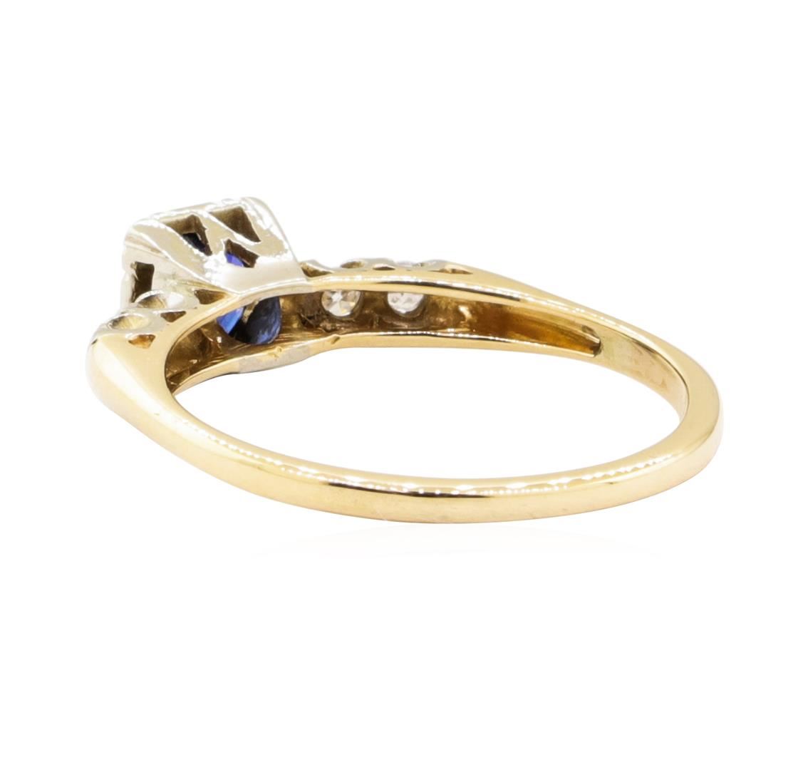 One vintage ring featuring: 14KT yellow and white gold weighing 2.2 grams containing one blue sapphire weighing 0.55ct and diamonds weighing 0.12ctw.