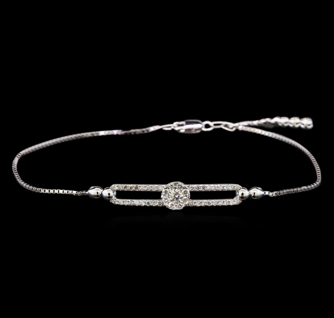 One electronically tested 14KT white gold ladies cast & assembled diamond bracelet. Seven and one half inch wearable length bracelet features a diamond set within a diamond bezel supported by parallel diamond ribbons on either side transitioning into a box chain, terminating in a lobster claw clasp with a diamond trio tassel. Bright polish finish. Identified with markings of "14K". Condition is new, good workmanship. Containing: One bezel set round brilliant cut diamond, measuring 3.30 - 3.30 x 2.00mm (depth est.) approximate weight of 0.14ct. Graded in the setting. Clarity: I-1. Color: G Eleven prong & channel set round brilliant cut diamonds, measuring 1.80 - 1.60 x 1.02mm (depth est.) approximate. Total Weight of 11 Stones = 0.20ct. Graded in the setting. Clarity: SI-2 to I-2. Color: G - I Thirty-Six prong set round brilliant cut diamonds, measuring 1.30 - 1.30 x 0.78mm (depth est.) approximate. Total Weight of 36 Stones = 0.33ct. Graded in the setting. Clarity: SI-2 to I-2. Color: G - I. Total Weight of Diamonds 0.67ct. Total Weight of Bracelet 4.62gm. AIG Appraised at $2,565.00.