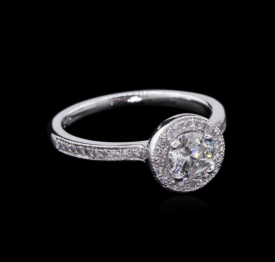 One electronically tested 14KT white gold lady's cast halo wedding ring with a bright polish with milgrain detailing finish. The featured lady's ring has a shank measuring 1.61 millimeters in width, Identified with markings of "14K". Condition is new, good workmanship. Containing: One prong set round brilliant cut diamond, measuring 5.24 - 5.22 x 2.85mm (depth est.) approximate weight of 0.47ct. Graded in the setting. Clarity: I-1. Color: Very Good Forty bead set round brilliant cut diamonds, measuring 1.15 - 1.00 x 0.70mm (depth est.) approximate total weight of 40 Stones = 0.20ct. Graded in the setting. Clarity: SI-1 to SI-2. Color: G - Very Good. Total Weight of Diamonds 0.67ct. Total Weight of Wedding Ring 2.80gm GAS Appraised at $3,275.00.