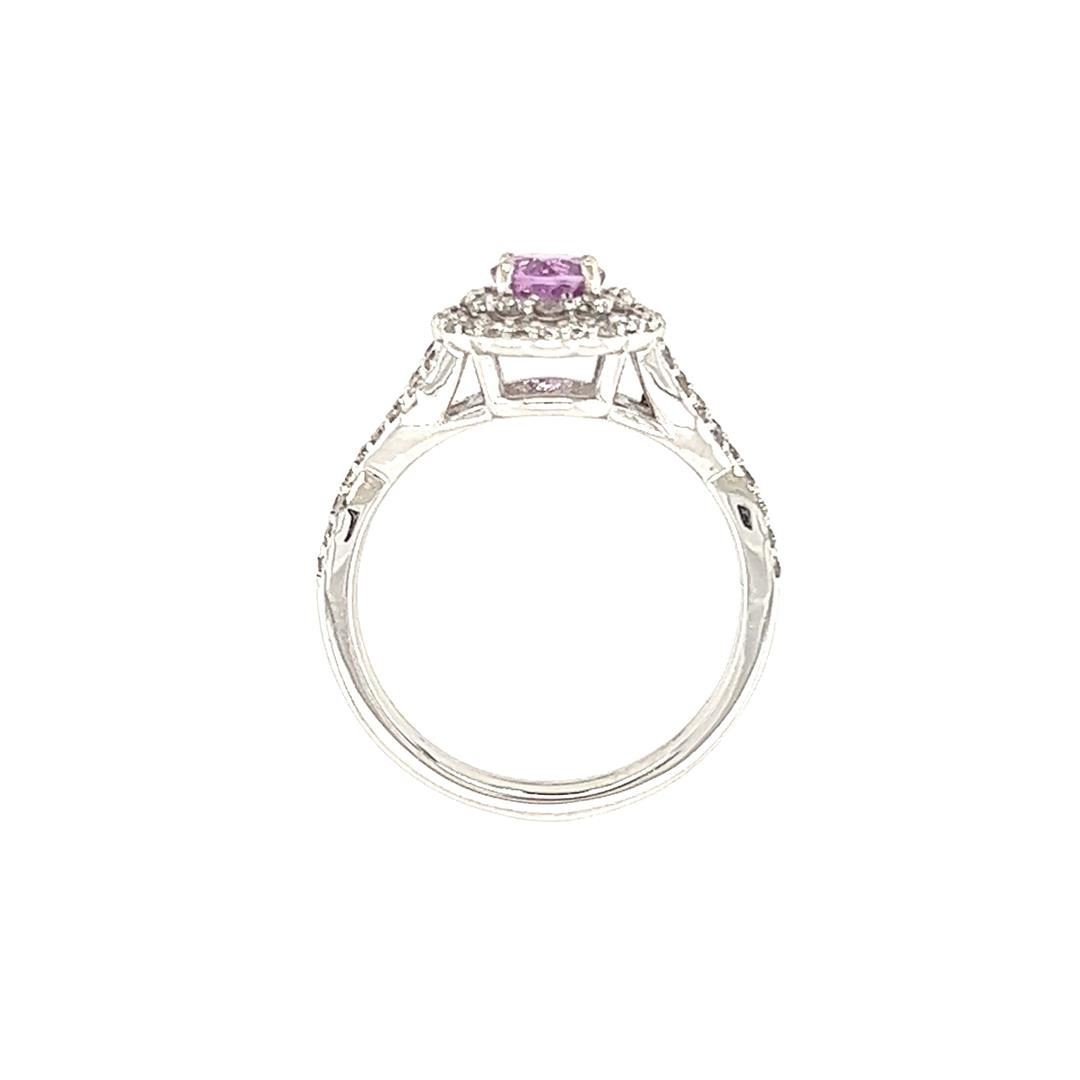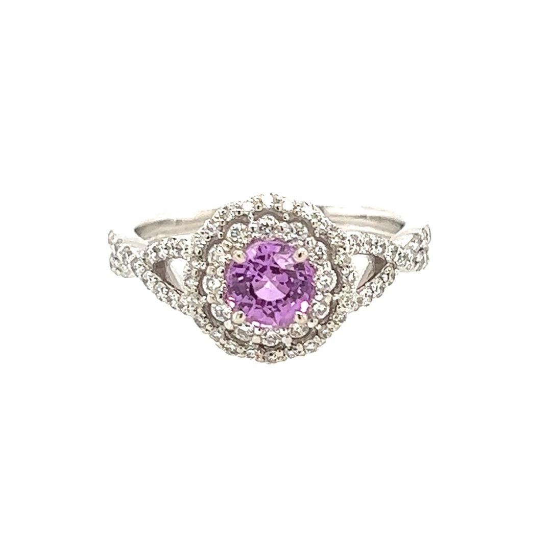 One electronically tested 14KT white gold lady's combination cast & assembled fashion ring with a double basket halo with a bright polish finish. Condition is new, good workmanship. The featured lady's ring has a cathedral crossover motif and a double shank measuring 2.60 millimeters in width. Identified with markings of "14K". Containing: One prong set round modified mixed cut natural pink sapphire, measuring 5.06 - 5.02 x 3.27 mm, (depth est.) approximate weight of 0.67ct., clarity is eye clean, medium, moderately strong, slightly purplish red color, (GIA slpR 5/4), cut is very good. Transmitting light with no distortion, transparent. Colored gemstones are presumed to have been subjected to commonly used enhancement processes. Graded in the setting. Sixty-eight prong set round brilliant cut diamonds, measuring 1.40 - 1.20 x 0.78mm (depth est.) approximate total weight of 68 Stones = 0.53ct. Graded in the setting. Color G - Clarity VS-2 to SI-1 Cut Very Good Total Weight of Colored Stones Total Weight of Diamonds Total Weight of Ring 0.67ct. 0.53ct. 4.00gm Appraisal No: 000022197002 Total Estimated Retail Value $ 4685.00
