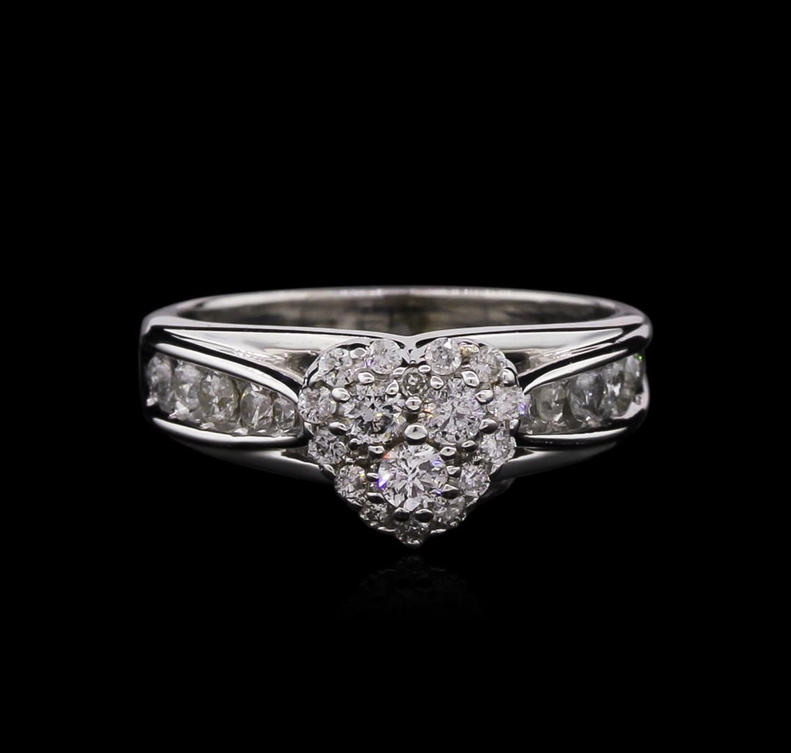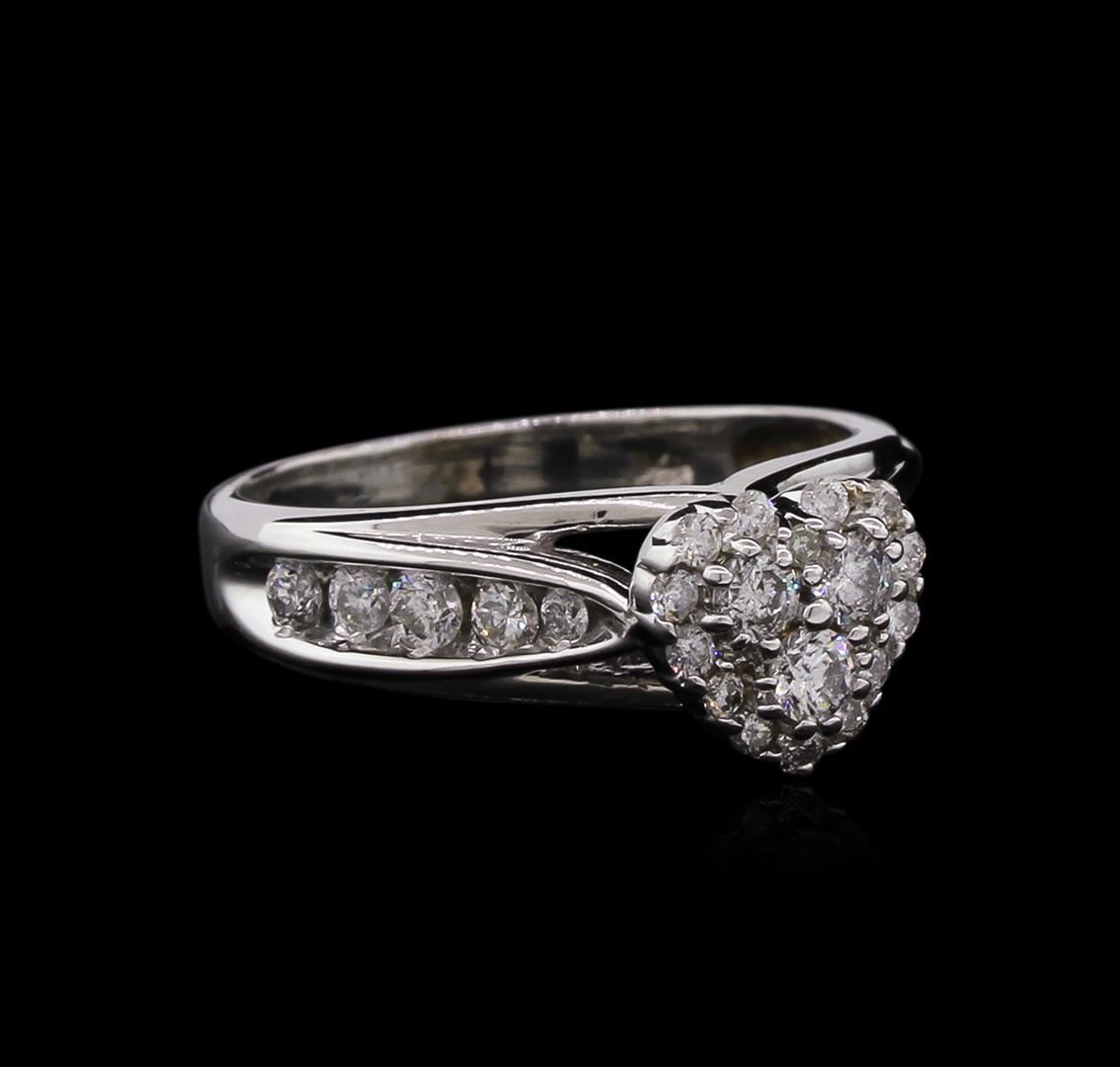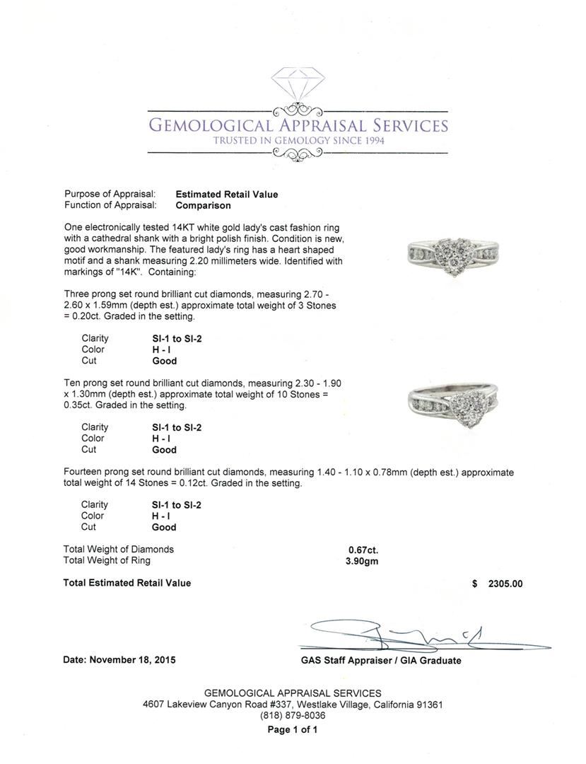 One electronically tested 14KT white gold lady's cast fashion ring with a cathedral shank with a bright polish finish. The featured lady's ring has a heart shaped motif and a shank measuring 2.20 millimeters wide. Identified with markings of "14K". Condition is new, good workmanship. Containing: Three prong set round brilliant cut diamonds, measuring 2.70 - 2.60 x 1.59mm (depth est.) approximate. Total Weight of 3 Stones = 0.20ct. Graded in the setting. Clarity: SI-1 to SI-2. Color: H - I. Cut Good Ten prong set round brilliant cut diamonds, measuring 2.30 - 1.90 x 1.30mm (depth est.) approximate. Total Weight of 10 Stones = 0.35ct. Graded in the setting. Clarity: SI-1 to SI-2. Color: H - I. Cut Good Fourteen prong set round brilliant cut diamonds, measuring 1.40 - 1.10 x 0.78mm (depth est.) approximate. Total Weight of 14 Stones = 0.12ct. Graded in the setting. Clarity: SI-1 to SI-2. Color: H - I. Cut Good. Total Weight of Diamonds 0.67ct. Total Weight of Ring 3.90gm. GAS Appraised.