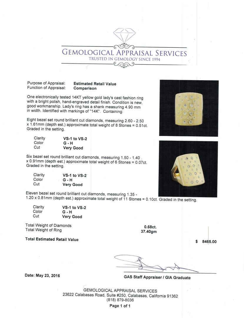 One electronically tested 14KT yellow gold lady's cast fashion ring with a bright polish, hand-engraved detail finish. Lady's ring has a shank measuring 4.90 mm in width. Identified with markings of "14K". Condition is new, good workmanship. Containing: Eight bezel set round brilliant cut diamonds, measuring 2.60 - 2.50 x 1.61mm (depth est.) approximate total weight of 8 Stones = 0.51ct. Graded in the setting. Clarity: VS-1 to VS-2. Color: G - H. Cut Very Good Six bezel set round brilliant cut diamonds, measuring 1.50 - 1.40 x 0.91mm (depth est.) approximate total weight of 6 Stones = 0.07ct. Graded in the setting. Clarity: VS-1 to VS-2. Color: G - Very Good Eleven bezel set round brilliant cut diamonds, measuring 1.35 - 1.20 x 0.81mm (depth est.) approximate total weight of 11 Stones = 0.10ct. Graded in the setting. Clarity: VS-1 to VS-2. Color: G - Very Good. Total Weight of Diamonds 0.68ct. Total Weight of Ring 37.40gm. GAS Appraised at $8,465.00.