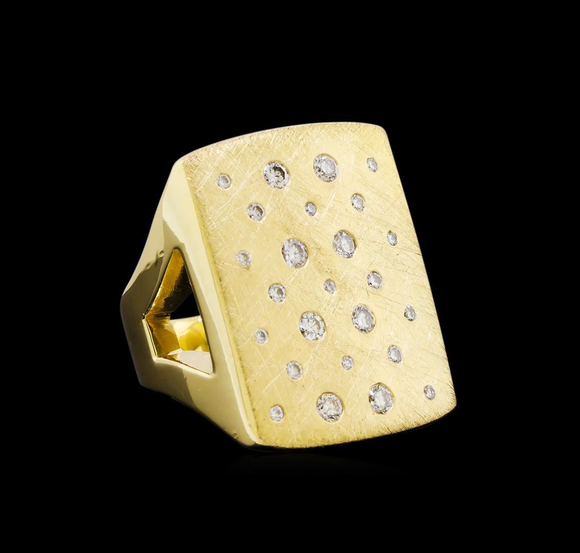 One electronically tested 14KT yellow gold lady's cast fashion ring with a bright polish, hand-engraved detail finish. Lady's ring has a shank measuring 4.90 mm in width. Identified with markings of "14K". Condition is new, good workmanship. Containing: Eight bezel set round brilliant cut diamonds, measuring 2.60 - 2.50 x 1.61mm (depth est.) approximate total weight of 8 Stones = 0.51ct. Graded in the setting. Clarity: VS-1 to VS-2. Color: G - H. Cut Very Good Six bezel set round brilliant cut diamonds, measuring 1.50 - 1.40 x 0.91mm (depth est.) approximate total weight of 6 Stones = 0.07ct. Graded in the setting. Clarity: VS-1 to VS-2. Color: G - Very Good Eleven bezel set round brilliant cut diamonds, measuring 1.35 - 1.20 x 0.81mm (depth est.) approximate total weight of 11 Stones = 0.10ct. Graded in the setting. Clarity: VS-1 to VS-2. Color: G - Very Good. Total Weight of Diamonds 0.68ct. Total Weight of Ring 37.40gm. GAS Appraised at $8,465.00.