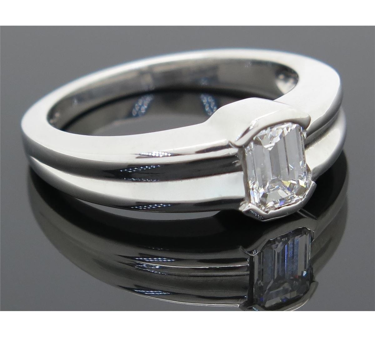 One tested 14K white gold diamond ring. Containing: One Emerald Cut Diamond. Approximate weight: .68CT, Clarity: VS2, Color: G-H. Diamonds are graded in the mounting, unless otherwise stated. Weight of ring: 5.9 grams. Size of chain: 7.0