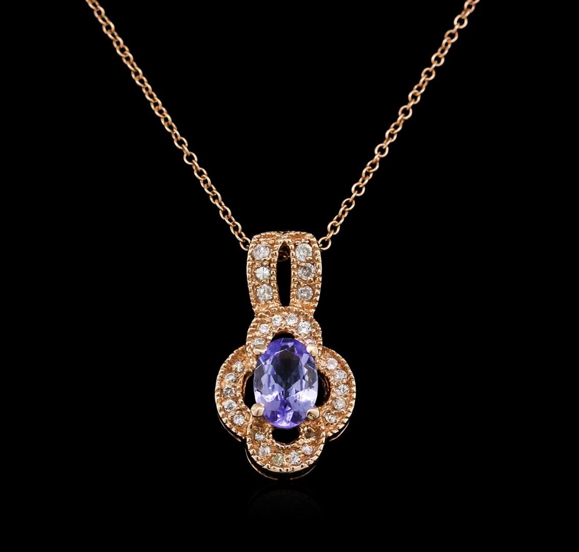 One pendant with chain featuring: 14KT rose gold weighing 3.14 grams containing one tanzanite with a total weight of 0.68ct and diamonds with a total weight of 0.15ct.