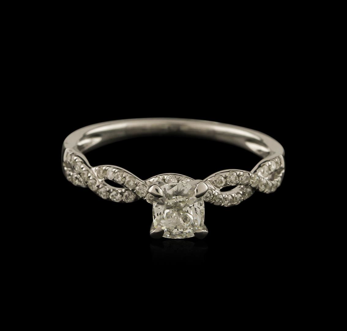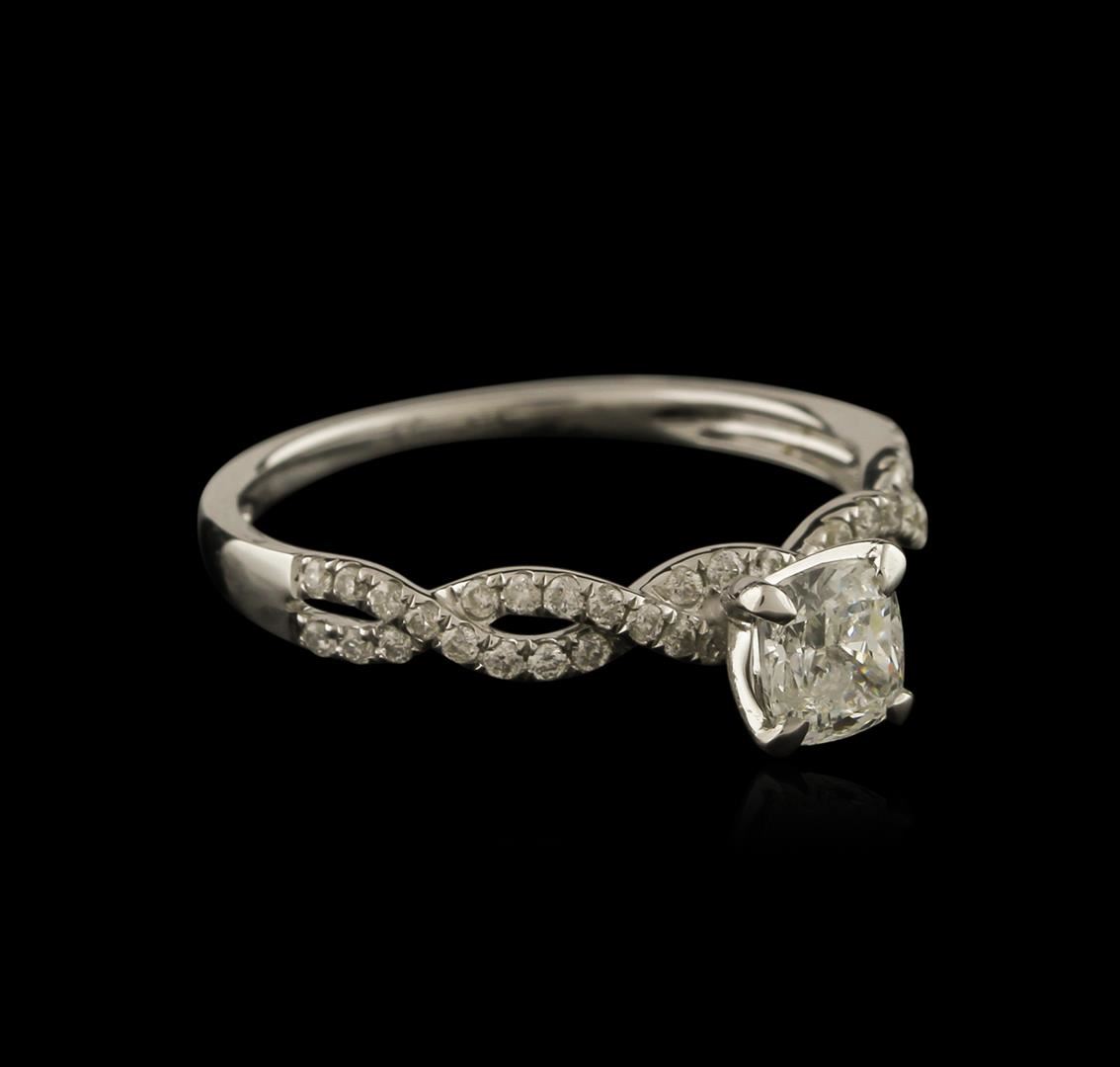 One ring featuring: 14KT white gold weighing 1.90 grams containing one prong set cushion cut diamond center stone with a total weight of 0.40ct and pave set round diamonds with a total weight of 0.28ct.