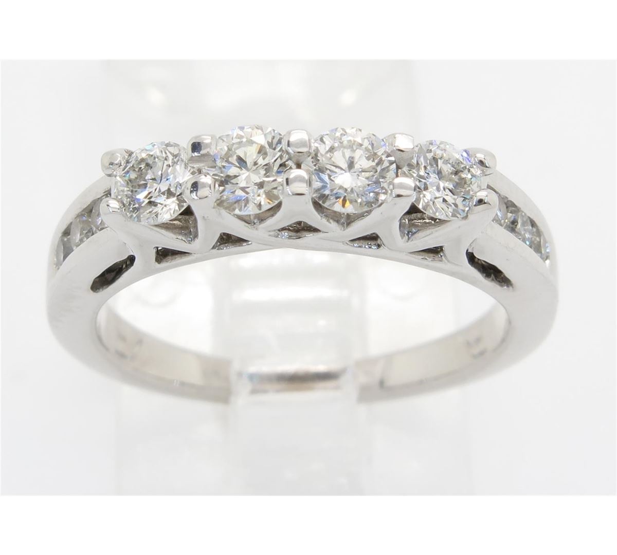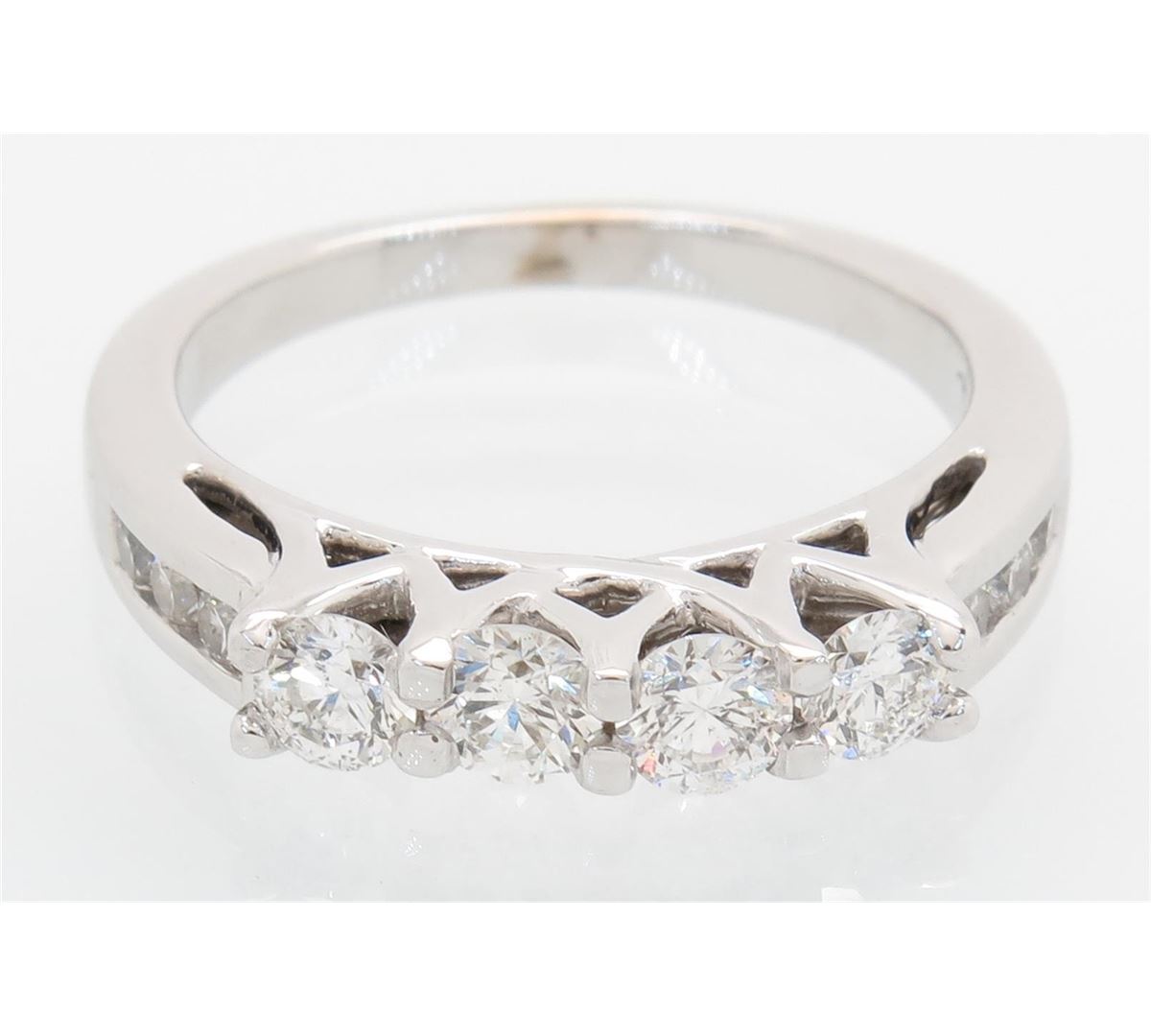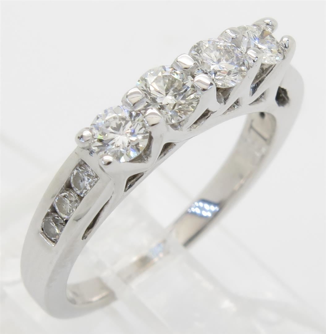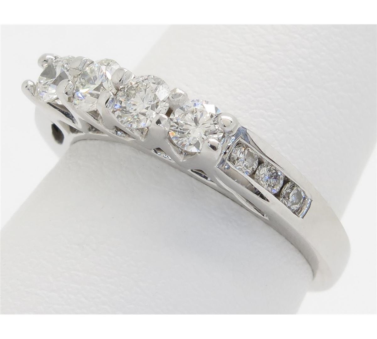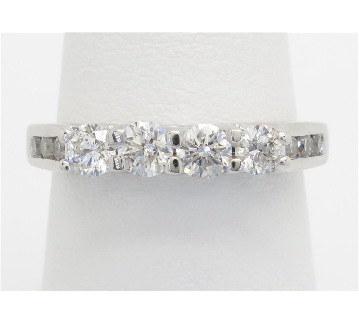 One tested 14K white gold Tolkowsky diamond band. Containing: 10 Round Brilliant Cut Diamonds. Clarity: I-SI, Color: G-H. Approximate total diamond weight: .68CTW. Diamonds are graded in the mounting, unless otherwise stated. Weight: 3.3 grams. Size: 5.00