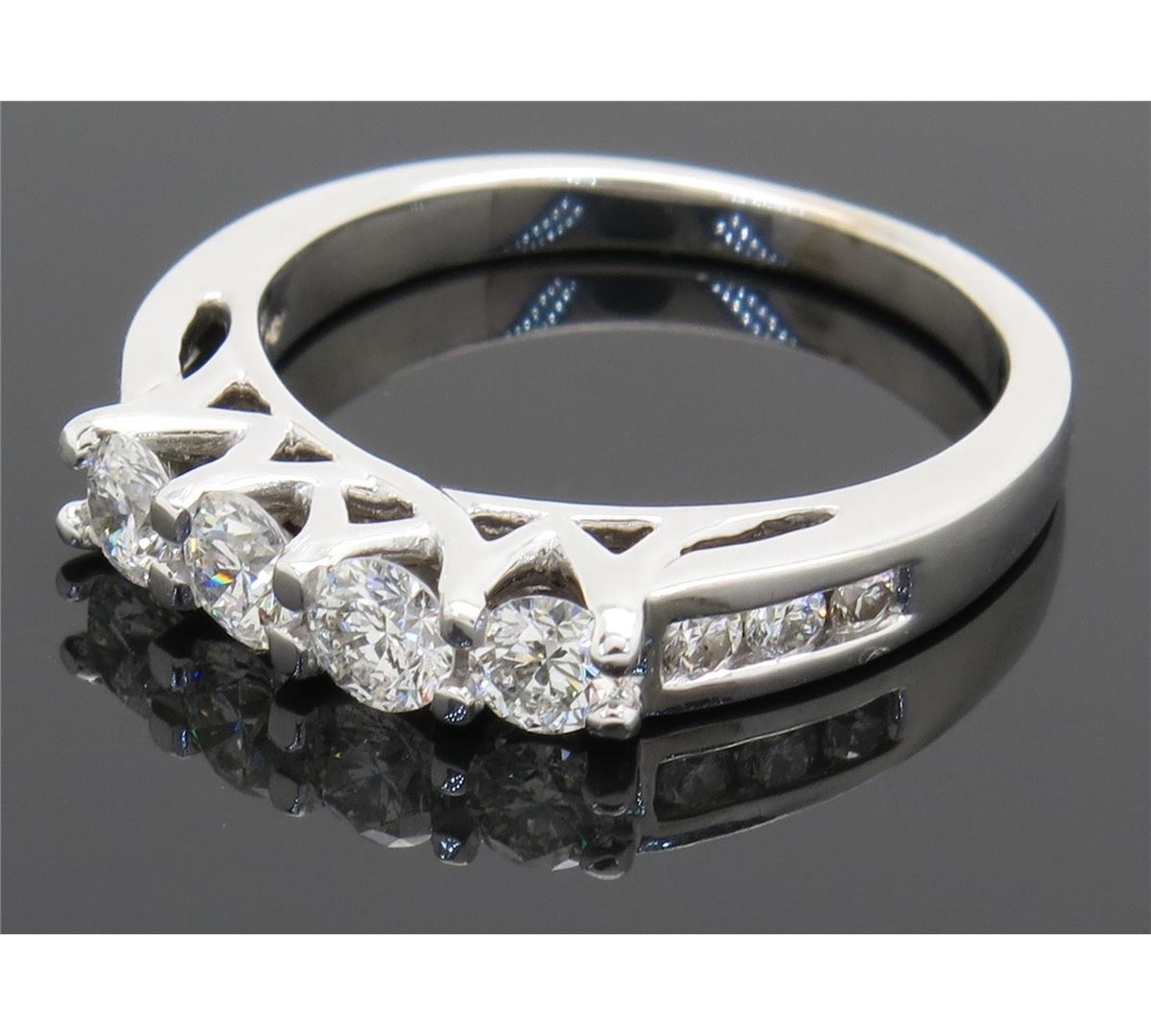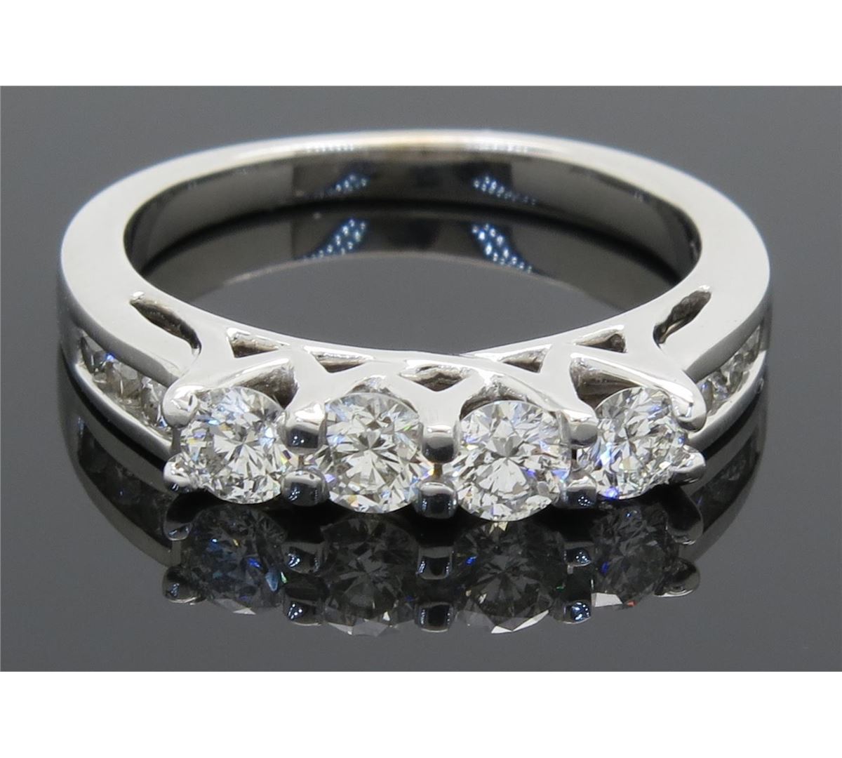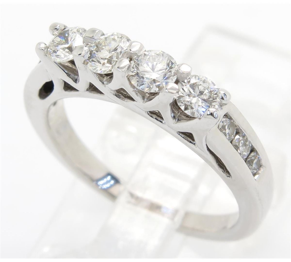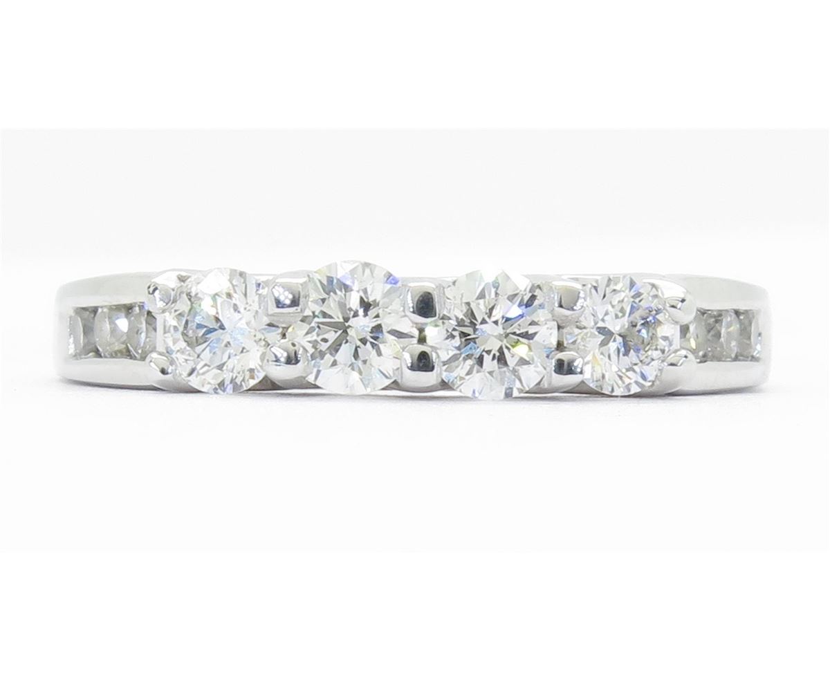 One tested 14K white gold Tolkowsky diamond band. Containing: 10 Round Brilliant Cut Diamonds. Clarity: I-SI, Color: G-H. Approximate total diamond weight: .68CTW. Diamonds are graded in the mounting, unless otherwise stated. Weight: 3.3 grams. Size: 5.00
