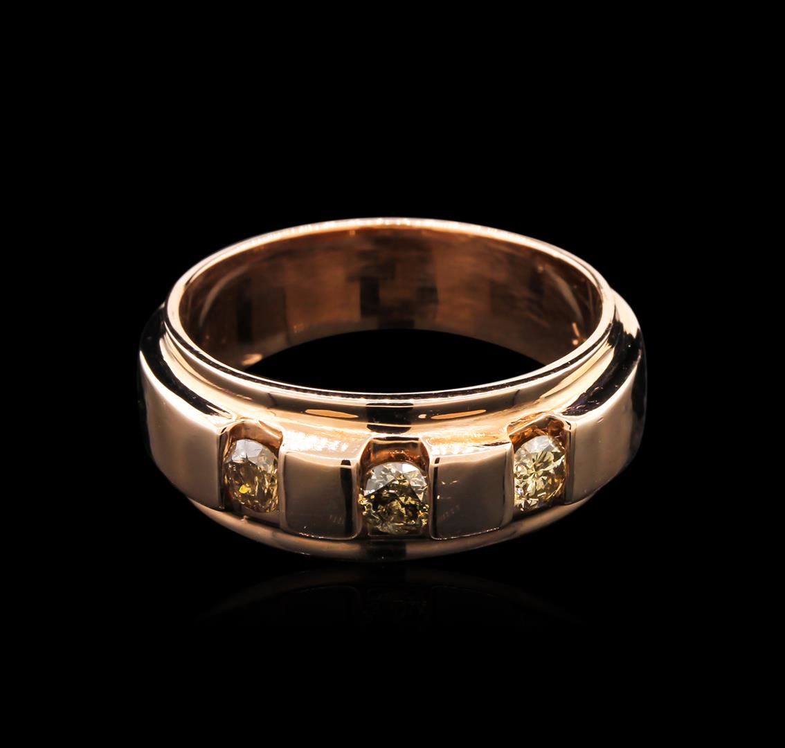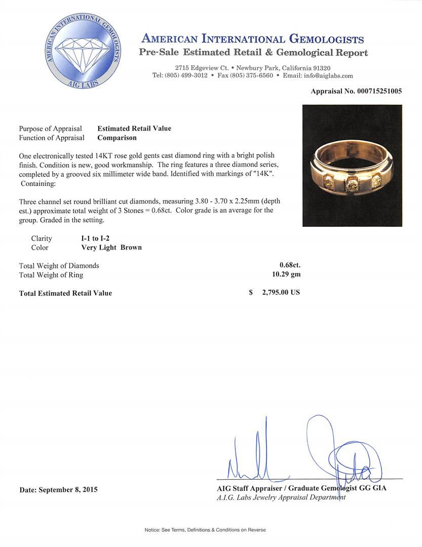 One electronically tested 14KT rose gold gents cast diamond ring with a bright polish finish. The ring features a three diamond series, completed by a grooved six millimeter wide band. Identified with markings of "14K". Condition is new, good workmanship. Containing: Three channel set round brilliant cut diamonds, measuring 3.80 - 3.70 x 2.25mm (depth est.) approximate total weight of 3 Stones = 0.68ct. Color grade is an average for the group. Graded in the setting. Clarity: I-1 to I-2. Total Weight of Diamonds 0.68ct. Total Weight of Ring 10.29gm. AIG Appraised at $2,795.00.