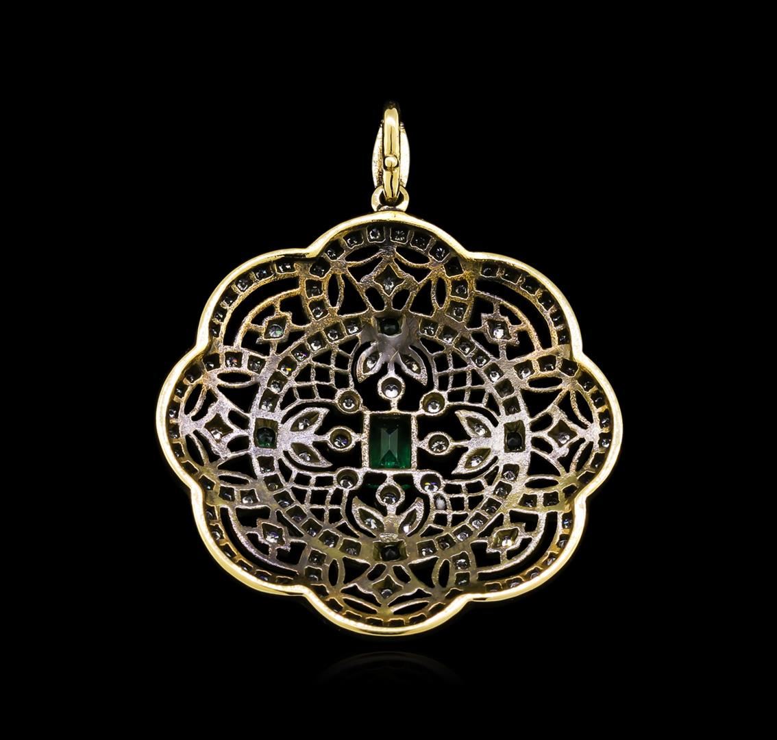 One electronically tested 18KT yellow lady's combination cast & assembled fashion pendant with a bright polish with milgrain detailing finish. Identified with markings of "18K". Condition is used, good workmanship. Containing: One prong set emerald step cut natural emerald, measuring 6.10 x 3.95 x 3.00mm, approximate weight of 0.53ct., clarity is moderately included, type III, medium, very slightly grayish, very slightly bluish green color, (GIA vslbG 5/3), cut is good. Transmitting light somewhat diffusely, transparent to translucent. Indications of oil residue. Graded in the setting. Four bezel set round standard brilliant cut natural emeralds, measuring 2.30 - 2.20 x 1.40 mm, approximate total weight of 0.16ct., clarity is eye clean, type III, medium, moderately strong, green color, (GIA G 5/4), cut is very good. Transmitting light with a minimum of distortion, transparent. Indications of oil residue. Graded in the setting. Six bezel set round brilliant cut diamonds, measuring 1.70 - 1.60 x 1.04mm (depth est.) approximate total weight of 6 Stones = 0.10ct. Graded in the setting. Clarity: VS-2 to SI-1. Color: H - I. Cut Very Good One Hundred Twenty-One prong set round brilliant cut diamonds, measuring 1.40 - 1.35 x 0.87mm (depth est.) approximate total weight of 121 Stones = 1.21ct. Graded in the setting. Clarity: VS-2 to SI-1. Color: G - I. Cut Good. Total Weight of Colored Stones 0.69ct. Total Weight of Diamonds 1.31ct. Total Weight of Pendant 13.70gm. GAS Appraised at $6,880.00.