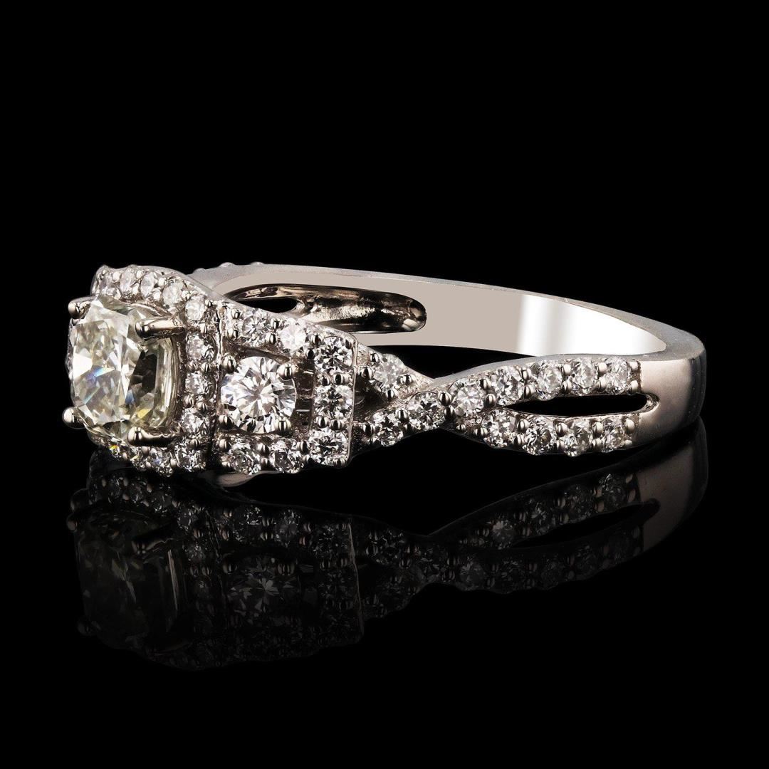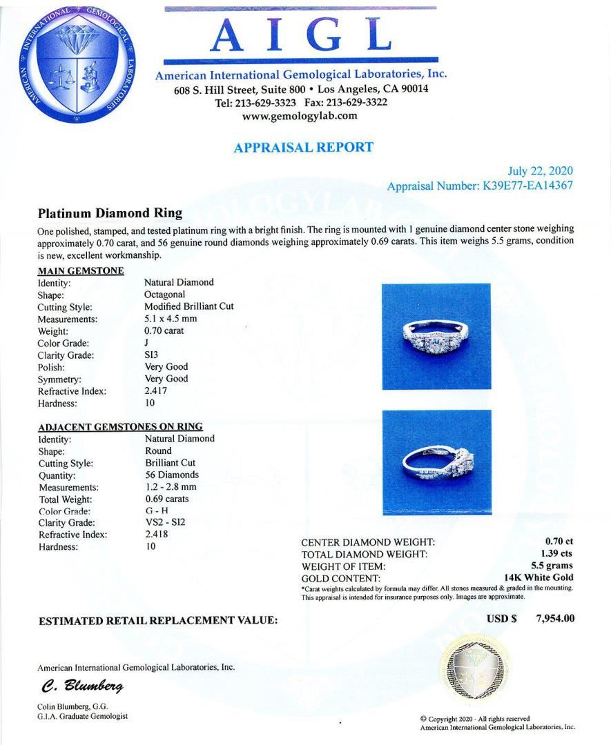 Platinum Diamond Ring One polished, stamped, and tested platinum ring with a bright finish. The ring is mounted with 1 genuine diamond center stone weighing approximately 0.70 carat, and 56 genuine round diamonds weighing approximately 0.69 carats. This item weighs 5.5 grams, condition is new, excellent workmanship. MAIN GEMSTONE Identity: Natural Diamond Shape: Octagonal Cutting Style: Modified Brilliant Cut Measurements: 5.1 x 4.5mm Weight: 0.70 carat Color Grade: J Clarity Grade: SI3 Polish: Very Good Symmetry: Very Good Refractive Index: 2.417 Hardness: 10 ADJACENT GEMSTONES ON RING Identity: Natural Diamond Shape: Round Cutting Style: Brilliant Cut Quantity: 56 Diamonds Measurements: 1.2 - 2.8mm Total Weight: 0.69 carats Color Grade: G - H Clarity Grade: VS2 to SI2 Refractive Index: 2.418 Hardness: 10 CENTER DIAMOND WEIGHT: 0.70ct TOTAL DIAMOND WEIGHT: 1.39ctw WEIGHT OF ITEM: 5.5 grams GOLD CONTENT: 14K White Gold #LREF-3977