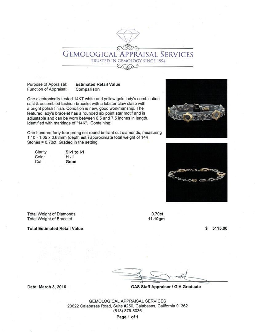 One electronically tested 14KT white and yellow gold lady's combination cast & assembled fashion bracelet with a lobster claw clasp with a bright polish finish. The featured lady's bracelet has a rounded six point star motif and is adjustable and can be worn between 6.5 and 7.5 inches in length. Identified with markings of "14K". Condition is new, good workmanship. Containing: One Hundred Forty-Four prong set round brilliant cut diamonds, measuring 1.10 - 1.05 x 0.68mm (depth est.) approximate total weight of 144 Stones = 0.70 ct. Graded in the setting. Clarity: SI-1 to I-1. Color: H - I. Cut Good. Total Weight of Diamonds 0.70 ct. Total Weight of Bracelet 11.10gm. GAS Appraised.