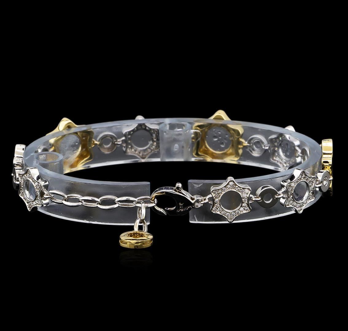 One electronically tested 14KT white and yellow gold lady's combination cast & assembled fashion bracelet with a lobster claw clasp with a bright polish finish. The featured lady's bracelet has a rounded six point star motif and is adjustable and can be worn between 6.5 and 7.5 inches in length. Identified with markings of "14K". Condition is new, good workmanship. Containing: One Hundred Forty-Four prong set round brilliant cut diamonds, measuring 1.10 - 1.05 x 0.68mm (depth est.) approximate total weight of 144 Stones = 0.70 ct. Graded in the setting. Clarity: SI-1 to I-1. Color: H - I. Cut Good. Total Weight of Diamonds 0.70 ct. Total Weight of Bracelet 11.10gm. GAS Appraised.