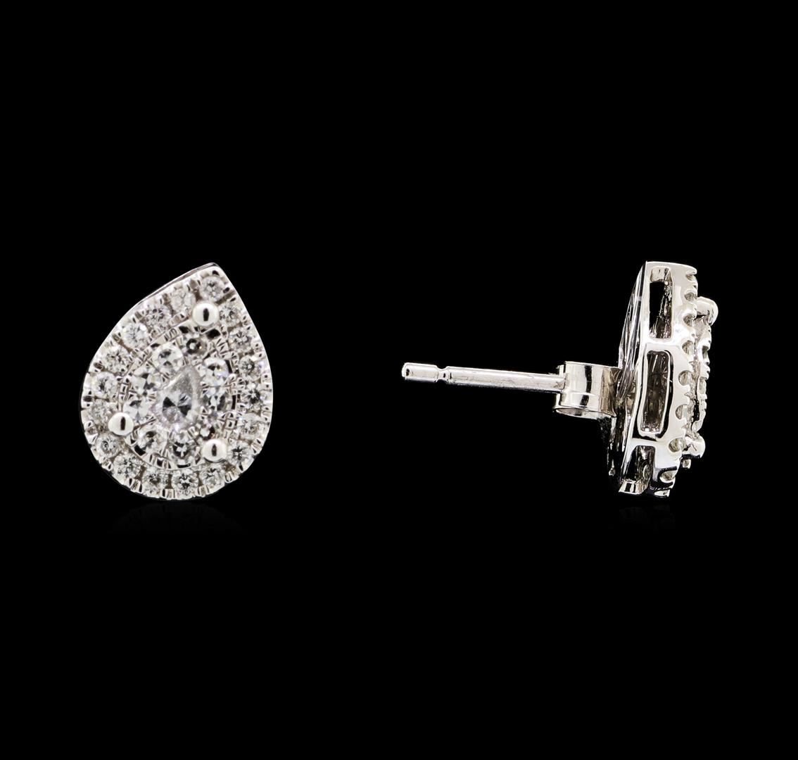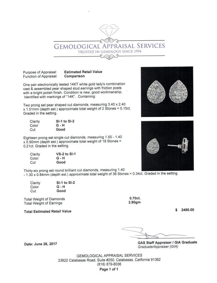 One pair electronically tested 14KT white gold lady's combination cast & assembled pear shaped stud earrings with friction posts with a bright polish finish. Identified with markings of '14K'. Condition is new, good workmanship. Containing: Two prong set pear shaped cut diamonds, measuring 3.40 x 2.40 x 1.51mm (depth est.) approximate total weight of 2 Stones = 0.15ct. Graded in the setting. Color G - H Clarity SI-1 to SI-2 Cut Good Eighteen prong set single cut diamonds, measuring 1.50 - 1.40 x 0.90mm (depth est.) approximate total weight of 18 Stones = 0.21ct. Graded in the setting. Color G - H Clarity VS-2 to SI-1 Cut Good Thirty-Six prong set round brilliant cut diamonds, measuring 1.40 - 1.30 x 0.84mm (depth est.) approximate total weight of 36 Stones = 0.34ct. Graded in the setting. Color G - H Clarity SI-1 to SI-2 Cut Good. Total Weight of Diamonds 0.70ct.. Total Weight of Earrings 2.80gm GAS Appraised at $2490.00. GAS Appraised at $2,490.00.