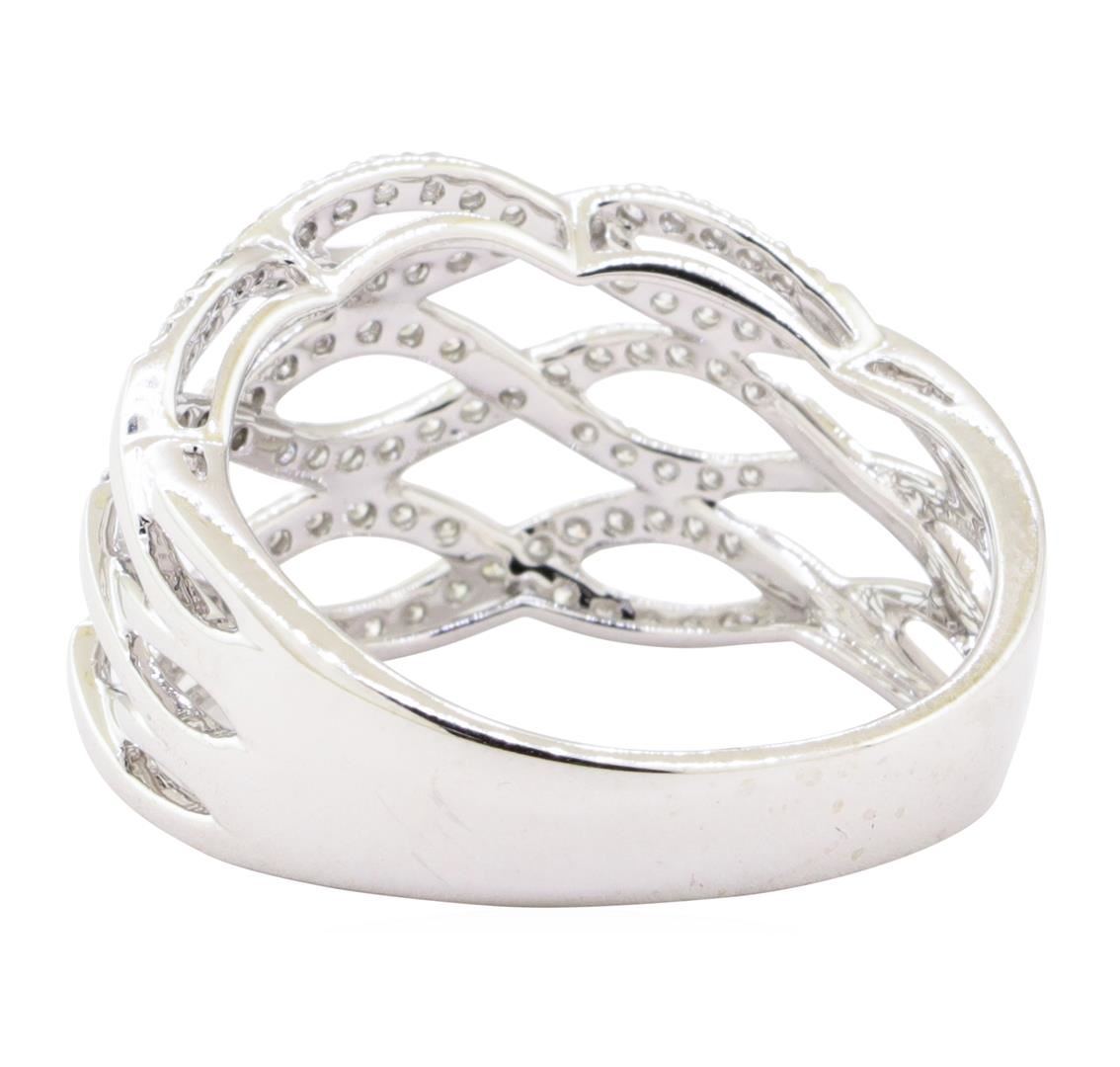 One electronically tested 18KT white gold lady's cast fashion ring with a 3 row undulating crossover motif with a bright polish finish. The featured lady's ring has a shank measuring 4.00 millimeters wide. Identified with markings of '18K'. Condition is n