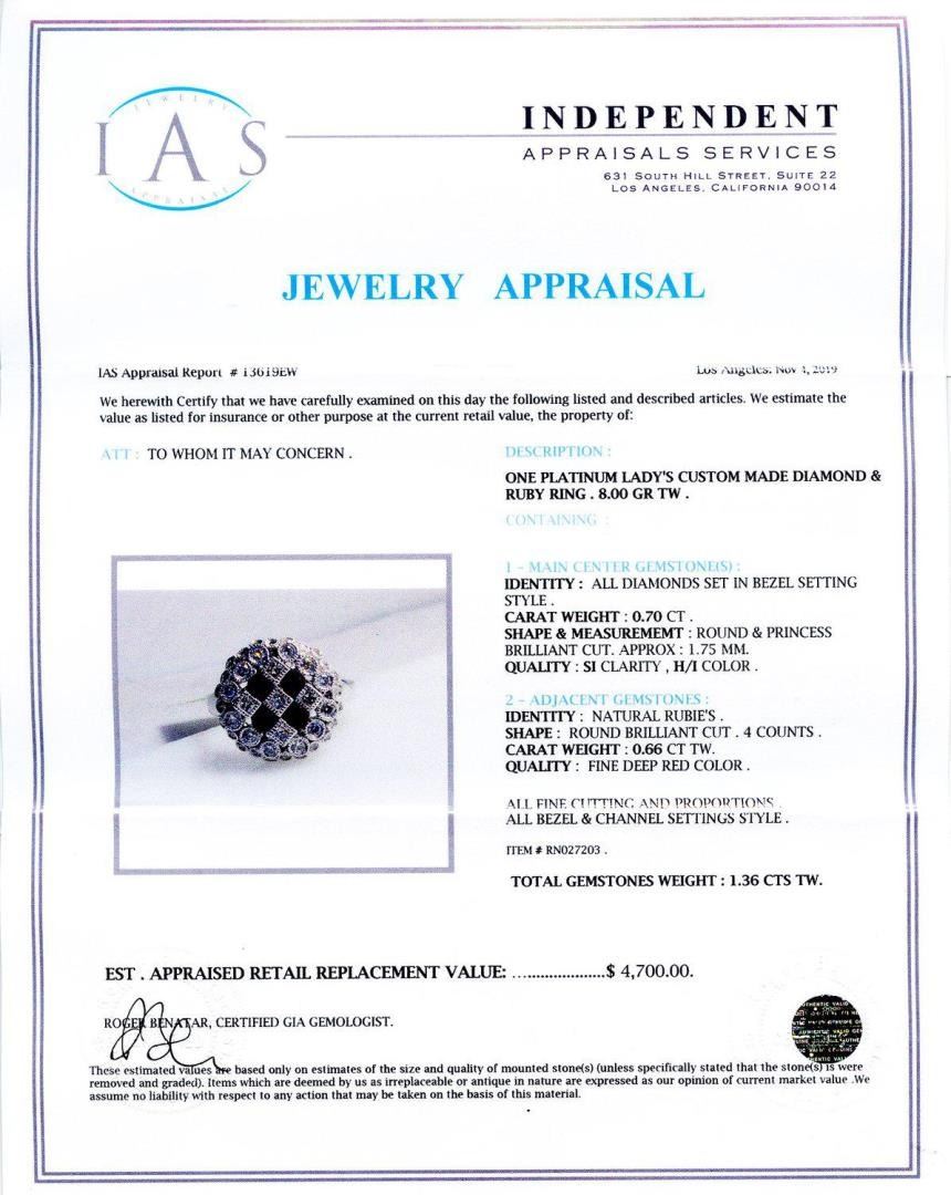 DESCRIPTION: ONE PLATINUM LADY'S CUSTOM MADE DIAMOND & RUBY RING. 8.00 GR TW. CONTAINING: 1 â€" MAIN CENTER GEMSTONE(S): IDENTITY : ALL DIAMONDS SET IN BEZEL SETTING STYLE. CARAT WEIGHT : 0.70 CT. SHAPE & MEASUREMEMT : ROUND & PRINCESS BRILLIANT CUT. APPROX : 1.75 MM. QUALITY : SI CLARITY , H/I COLOR. 2 â€" ADJACENT GEMSTONES: IDENTITY : NATURAL RUBIES. SHAPE : ROUND BRILLIANT CUT. 4 COUNTS. CARAT WEIGHT : 0.66 CT TW. QUALITY : FINE DEEP RED COLOR. ALL FINE CUTTING AND PROPORTIONS. ALL BEZEL & CHANNEL SETTINGS STYLE. TOTAL GEMSTONES WEIGHT : 1.36 CTS TW. #Size: 7 1/2