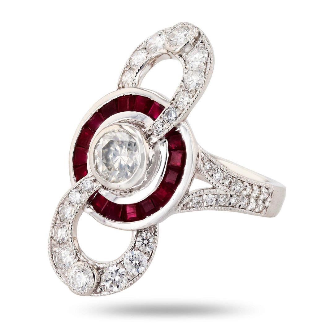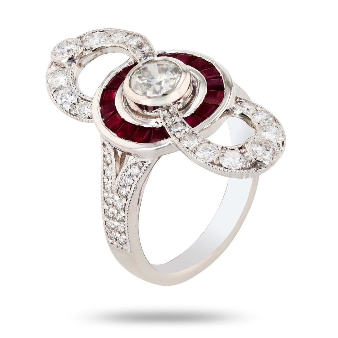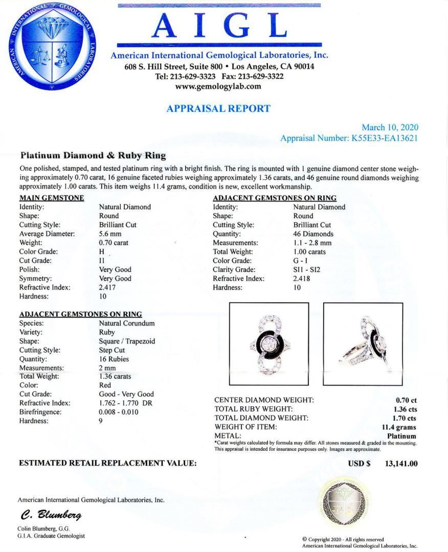 Platinum Diamond & Ruby Ring One polished, stamped, and tested platinum ring with a bright finish. The ring is mounted with 1 genuine diamond center stone weigh-ing approximately 0.70 carat, 16 genuine faceted rubies weighing approximately 1.36 carats, and 46 genuine round diamonds weighing approximately 1.00 carats. This item weighs 11.4 grams, condition is new, excellent workmanship. MAIN GEMSTONE Identity: Natural Diamond Shape: Round Cutting Style: Brilliant Cut Average Diameter: 5.6 mm Weight: 0.70 carat Color Grade: H Cut Grade: I1 Polish: Very Good Symmetry: Very Good Refractive Index: 2.417 Hardness: 10 ADJACENT GEMSTONES ON RING Identity: Natural Diamond Shape: Round Cutting Style: Brilliant Cut Quantity: 46 Diamonds Measurements: 1.1 - 2.8mm Total Weight: 1.00 carats Color Grade: G - I Clarity Grade: SI1 to SI2 Refractive Index: 2.418 Hardness: 10 ADJACENT GEMSTONES ON RING Species: Natural Corundum Variety: Ruby Shape: Square / Trapezoid Cutting Style: Step Cut Quantity: 16 Rubies Measurements: 2mm Total Weight: 1.36 carats Color: Red Cut Grade: Good - Very Good Refractive Index: 1.762 - 1.770 DR Birefringence: 0.008 - 0.010 Hardness: 9 CENTER DIAMOND WEIGHT: 0.70ct TOTAL RUBY WEIGHT: 1.36ctw TOTAL DIAMOND WEIGHT: 1.70ctw WEIGHT OF ITEM: 11.4 grams METAL: Platinum