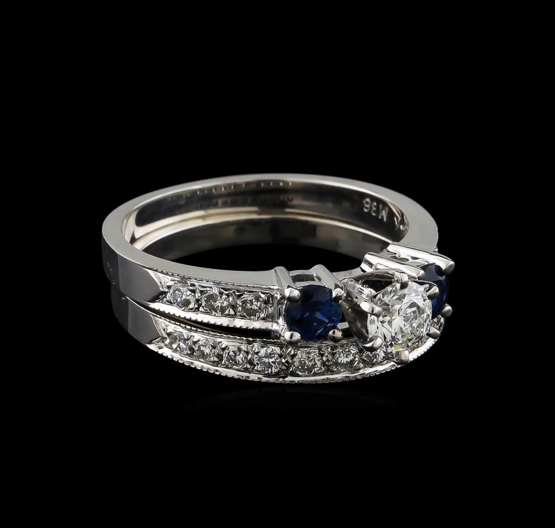 One set electronically tested 14KT white gold lady's cast wedding ring & wedding band with a bright polish with milgrain detailing finish. The featured lady's wedding set has a double shank measuring 4.11 millimeters wide. Identified with markings of "14K". Condition is new, good workmanship. Containing: Two prong set round modified brilliant cut natural blue sapphires, measuring 3.51 - 3.43 x 2.26 mm, approximate total weight of 0.44ct., clarity is eye clean, type II, medium dark, moderately strong, blue color, (GIA B 6/4), cut is very good. Transmitting light with no distortion, transparent. Colored gemstones are presumed to have been subjected to commonly used enhancement processes. Graded in the setting. One prong set round brilliant cut diamond, measuring 4.44 - 4.43 x 2.80mm (depth est.) approximate weight of 0.35ct. Graded in the setting. Clarity: I-1. Color: Very Good Seventeen prong set round brilliant cut diamonds, measuring 1.90 - 1.60 x 1.09mm (depth est.) approximate total weight of 17 Stones = 0.35ct. Graded in the setting. Clarity: SI-1 to I-1. Color: G - Good. Total Weight of Colored Stones 0.44ct. Total Weight of Diamonds 0.70ct. Total Weight of Ring & Wedding Band 5.90gm. GAS Appraised at $3,360.00.