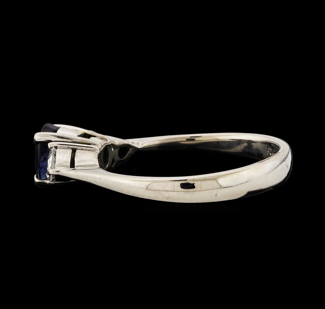 One electronically tested 14KT white gold lady's cast three stone straight line ring with a tapered cathedral shank with a bright polish finish. The featured lady's ring has a shank measuring 2.93 millimeters wide. Identified with markings of '14K'. Condition is like new, good workmanship. Containing: One prong set oval modified brilliant cut natural blue sapphire, measuring 5.92 x 4.93 x 2.75mm, (depth est.) approximate weight of 0.70ct., clarity is slightly included, medium dark, moderately strong, blue color, (GIA B 6/4), cut is good. Transmitting light with a minimum of distortion, transparent. Colored gemstones are presumed to have been subjected to commonly used enhancement processes. Minute abrasions on table and crown. Graded in the setting. Two prong set pear shaped cut diamonds, measuring 5.00 x 3.17 x 2.15mm (depth est.) approximate total weight of 2 Stones = 0.40ct. Graded in the setting. Clarity VS-2 to SI-1. Color: F - G Cut Very Good. Total Weight of Colored Stones 0.70ct.. Total Weight of Diamonds 0.40ct.. Total Weight of Ring 3.30gm GAS Appraised at $2,755.00.