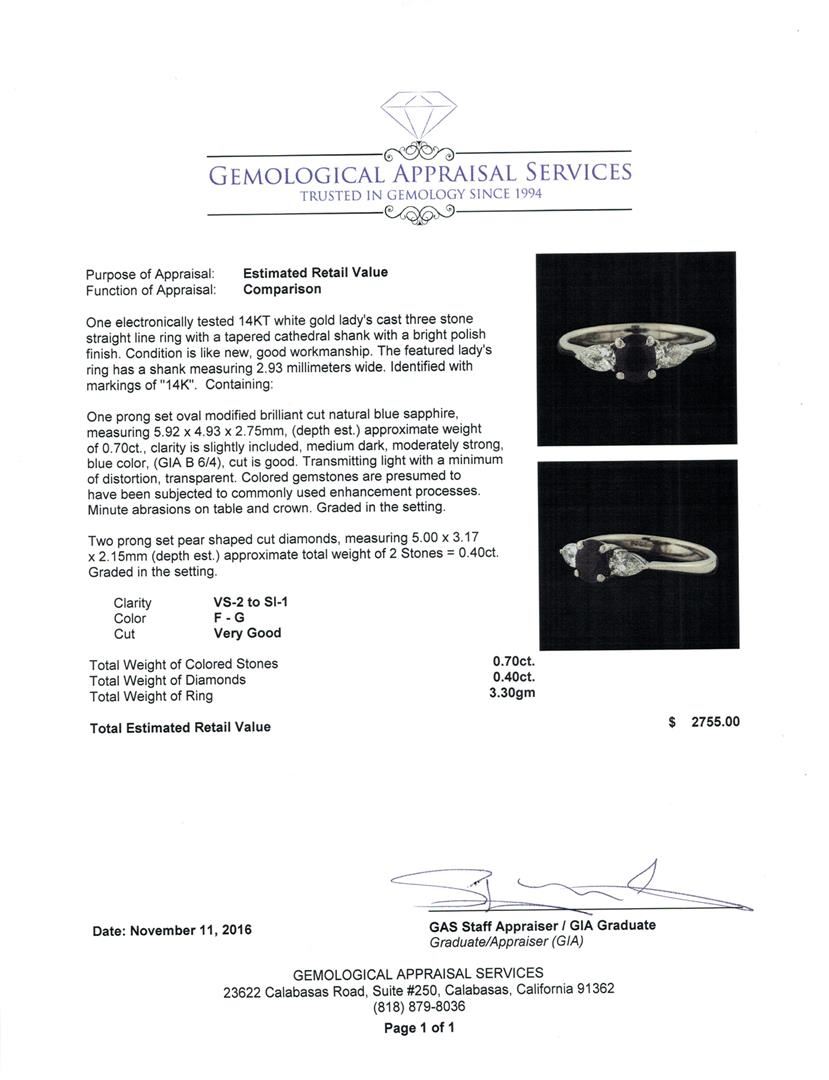 One electronically tested 14KT white gold lady's cast three stone straight line ring with a tapered cathedral shank with a bright polish finish. The featured lady's ring has a shank measuring 2.93 millimeters wide. Identified with markings of '14K'. Condition is like new, good workmanship. Containing: One prong set oval modified brilliant cut natural blue sapphire, measuring 5.92 x 4.93 x 2.75mm, (depth est.) approximate weight of 0.70ct., clarity is slightly included, medium dark, moderately strong, blue color, (GIA B 6/4), cut is good. Transmitting light with a minimum of distortion, transparent. Colored gemstones are presumed to have been subjected to commonly used enhancement processes. Minute abrasions on table and crown. Graded in the setting. Two prong set pear shaped cut diamonds, measuring 5.00 x 3.17 x 2.15mm (depth est.) approximate total weight of 2 Stones = 0.40ct. Graded in the setting. Clarity VS-2 to SI-1. Color: F - G Cut Very Good. Total Weight of Colored Stones 0.70ct.. Total Weight of Diamonds 0.40ct.. Total Weight of Ring 3.30gm GAS Appraised at $2,755.00.