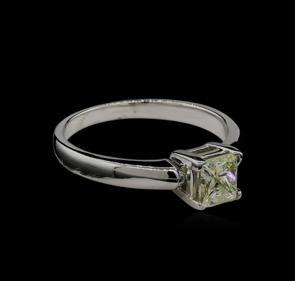 One electronically tested 14KT white gold ladies cast diamond solitaire ring with a bright finish. Identified with markings of "14K". Condition is new, good workmanship. Containing: One prong set princess cut diamond, measuring 5.16 x 4.50 x 3.49mm (depth est.), 7.00.%. GTCF approximate weight of 0.70ct with a faint blue fluorescence. Graded in the setting. Clarity: SI-1. Depth: 77.6%. Table 82.2%. Pavil. Depth%. 61.1%. Total Weight of Diamonds 0.70ct. Total Weight of Solitaire Ring 3.09gm. AIG Appraised at $2,550.00.