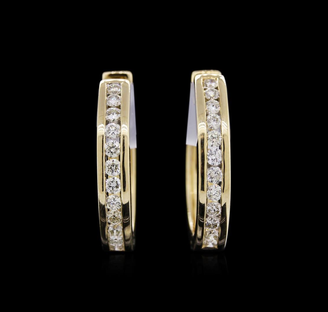 One pair electronically tested 14KT yellow gold ladies cast diamond hoop earrings with hinged clip backs with a bright polish finish. Identified with markings of "14K". Condition is new. Containing: Twenty-Four channel set round brilliant cut diamonds, measuring 2.00 - 2.00 x 1.20mm (depth est.) approximate total weight of 24 Stones = 0.70ct. Clarity: SI-2 to I-1. Color: J - K, Cut is Good. Diamonds are graded in the mounting, unless otherwise stated. Total Weight of Diamonds 0.70ct. Total Weight of Hoop Earrings 9.80 grams. GGL Appraised at $2,485.00.