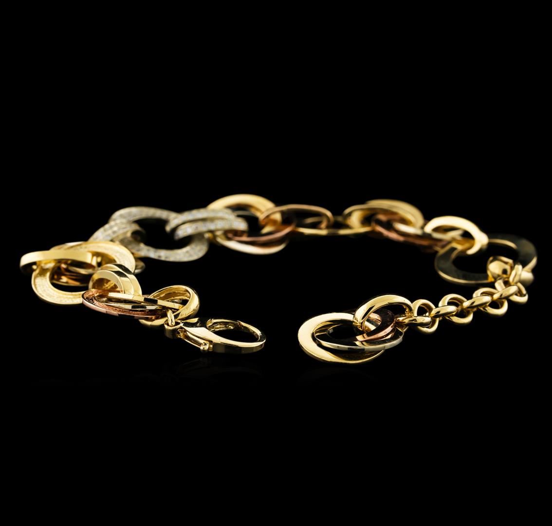 One electronically tested 14KT yellow, white, and rose gold lady's combination cast & assembled fashion bracelet with a lobster claw clasp with a bright polish finish. The featured lady's bracelet is adjustable and can be worn between 6.5 and 7.5 inches in length. Identified with markings of "K14". Condition is new, good workmanship. Containing: Forty-Four prong set round brilliant cut diamonds, measuring 1.30 - 1.20 x 0.78mm (depth est.) approximate total weight of 44 Stones = 0.33ct. Graded in the setting. Clarity: SI-1 to I-1. Color: H - I. Cut Good Seventy-Six prong set round brilliant cut diamonds, measuring 1.15 - 1.05 x 0.68mm (depth est.) approximate total weight of 76 Stones = 0.38ct. Graded in the setting. Clarity: SI-1 to I-1. Color: H - I. Cut Good. Total Weight of Diamonds 0.71ct. Total Weight of Bracelet 21.40gm GAS Appraised at $6,230.00.