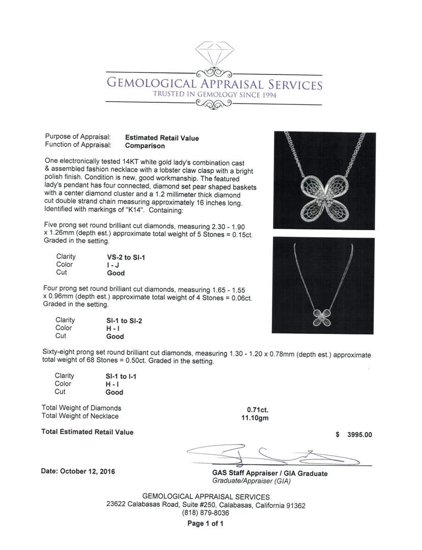 One electronically tested 14KT white gold lady's combination cast & assembled fashion necklace with a lobster claw clasp with a bright polish finish. The featured lady's pendant has four connected, diamond set pear shaped baskets with a center diamond cluster and a 1.2 millimeter thick diamond cut double strand chain measuring approximately 16 inches long. Identified with markings of 'K14'. Condition is new, good workmanship. Containing: Five prong set round brilliant cut diamonds, measuring 2.30 - 1.90 x 1.26mm (depth est.) approximate total weight of 5 Stones = 0.15ct. Graded in the setting. Clarity VS-2 to SI-1. Color: I - J Cut Good Four prong set round brilliant cut diamonds, measuring 1.65 - 1.55 x 0.96mm (depth est.) approximate total weight of 4 Stones = 0.06ct. Graded in the setting. Clarity SI-1 to SI-2. Color: H - I Cut Good Sixty-Eight prong set round brilliant cut diamonds, measuring 1.30 - 1.20 x 0.78mm (depth est.) approximate total weight of 68 Stones = 0.50ct. Graded in the setting. Clarity SI-1 to I-1. Color: H - I Cut Good. Total Weight of Diamonds 0.71ct.. Total Weight of Necklace 11.10gm. GAS Appraised at $3,995.00.