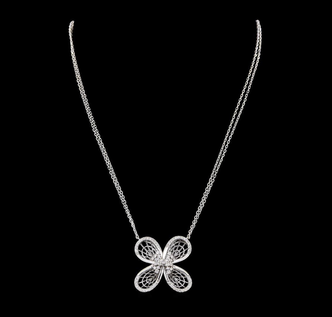 One electronically tested 14KT white gold lady's combination cast & assembled fashion necklace with a lobster claw clasp with a bright polish finish. The featured lady's pendant has four connected, diamond set pear shaped baskets with a center diamond cluster and a 1.2 millimeter thick diamond cut double strand chain measuring approximately 16 inches long. Identified with markings of 'K14'. Condition is new, good workmanship. Containing: Five prong set round brilliant cut diamonds, measuring 2.30 - 1.90 x 1.26mm (depth est.) approximate total weight of 5 Stones = 0.15ct. Graded in the setting. Clarity VS-2 to SI-1. Color: I - J Cut Good Four prong set round brilliant cut diamonds, measuring 1.65 - 1.55 x 0.96mm (depth est.) approximate total weight of 4 Stones = 0.06ct. Graded in the setting. Clarity SI-1 to SI-2. Color: H - I Cut Good Sixty-Eight prong set round brilliant cut diamonds, measuring 1.30 - 1.20 x 0.78mm (depth est.) approximate total weight of 68 Stones = 0.50 ct. Graded in the setting. Clarity SI-1 to I-1. Color: H - I Cut Good. Total Weight of Diamonds 0.71ct.. Total Weight of Necklace 11.10gm. GAS Appraised.