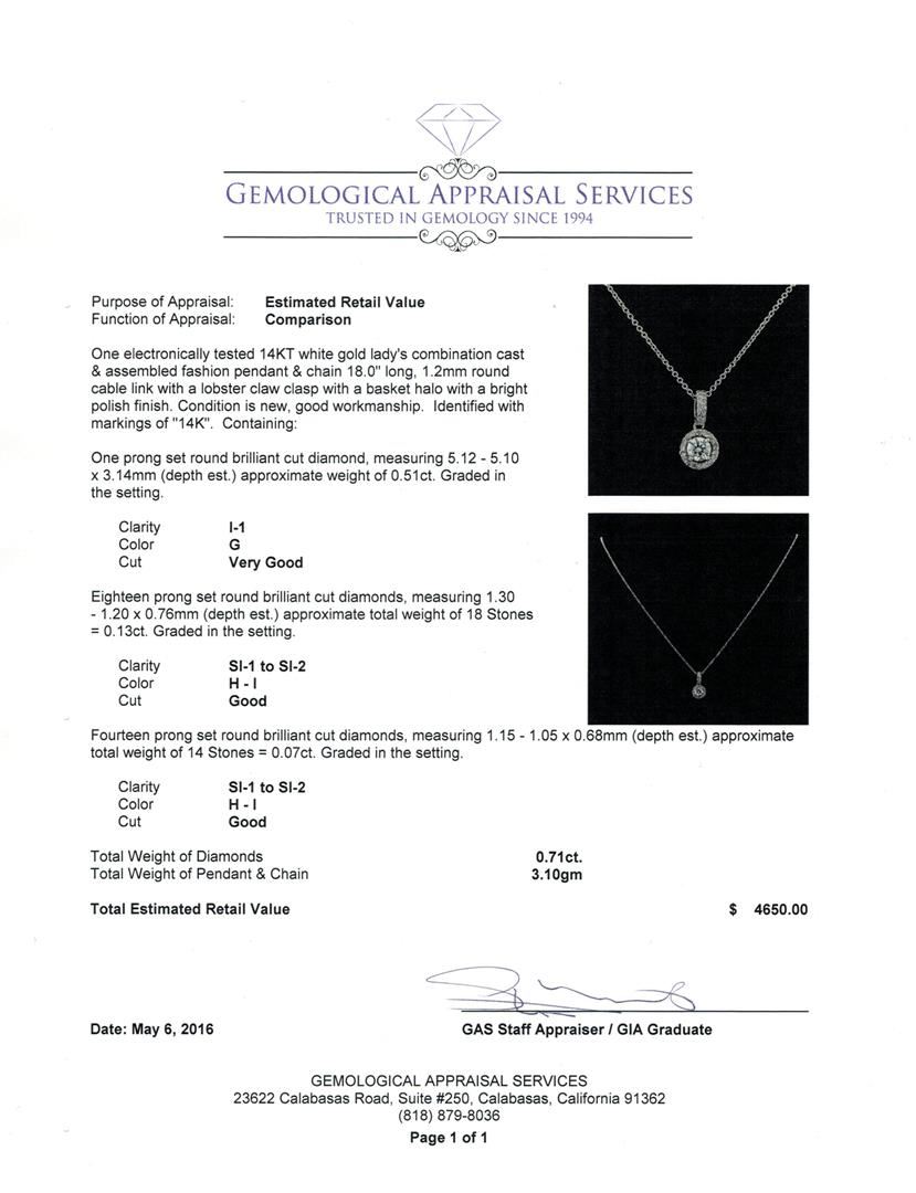 One electronically tested 14KT white gold lady's combination cast & assembled fashion pendant & chain 18.0" long, 1.2mm round cable link with a lobster claw clasp with a basket halo with a bright polish finish. Identified with markings of "14K". Condition is new, good workmanship. Containing: One prong set round brilliant cut diamond, measuring 5.12 - 5.10 x 3.14mm (depth est.) approximate weight of 0.51ct. Graded in the setting. Clarity: I-1. Color: G. Cut Very Good Eighteen prong set round brilliant cut diamonds, measuring 1.30 - 1.20 x 0.76mm (depth est.) approximate total weight of 18 Stones = 0.13ct. Graded in the setting. Clarity: SI-1 to SI-2. Color: H - I. Cut Good Fourteen prong set round brilliant cut diamonds, measuring 1.15 - 1.05 x 0.68mm (depth est.) approximate total weight of 14 Stones = 0.07ct. Graded in the setting. Clarity: SI-1 to SI-2. Color: H - I. Cut Good. Total Weight of Diamonds 0.71ct. Total Weight of Pendant & Chain 3.10gm GAS Appraised at $4,650.00.