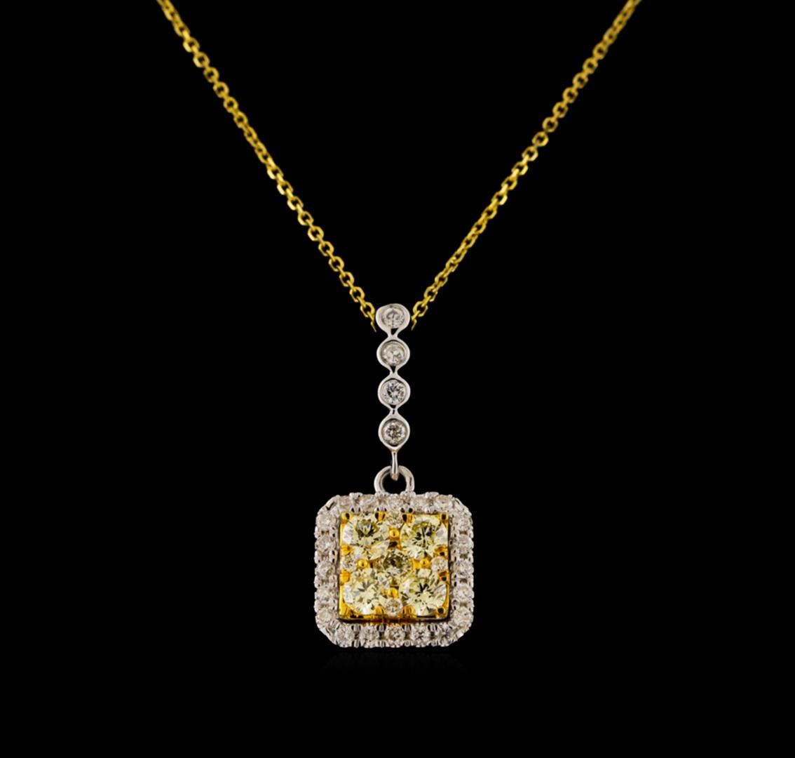 One electronically tested 14KT yellow and white gold lady's combination cast & assembled fashion pendant & chain 18.0' long, 1mm diamond cut oval cable link with a spring ring clasp with a bright polish finish. Identified with markings of '14K'. Condition is new, good workmanship. Containing: Four prong set round brilliant cut diamonds, measuring 3.20 - 3.10 x 1.95mm (depth est.) approximate total weight of 4 Stones = 0.48ct. Graded in the setting. Clarity SI-1 to SI-2 Cut Very Good One prong set round brilliant cut diamond, measuring 2.30 - 2.25 x 1.41mm (depth est.) approximate weight of 0.04ct. Graded in the setting. Clarity SI-1 Cut Very Good Four prong set round brilliant cut diamonds, measuring 1.10 - 1.05 x 0.67mm (depth est.) approximate total weight of 4 Stones = 0.02ct. Graded in the setting. Clarity VS-2 to SI-1 Cut Good Twenty prong set round brilliant cut diamonds, measuring 1.20 - 1.15 x 0.73mm (depth est.) approximate total weight of 20 Stones = 0.13ct. Graded in the setting. Clarity SI-1 to I-1. Color: H - I Cut Good Four bezel set round brilliant cut diamonds, measuring 1.40 - 1.35 x 0.86mm (depth est.) approximate total weight of 4 Stones = 0.04ct. Graded in the setting. Clarity SI-1 to SI-2. Color: G - H Cut Good. Total Weight of Diamonds 0.71ct.. Total Weight of Pendant & Chain 2.80gm. GAS Appraised at $3,390.00.