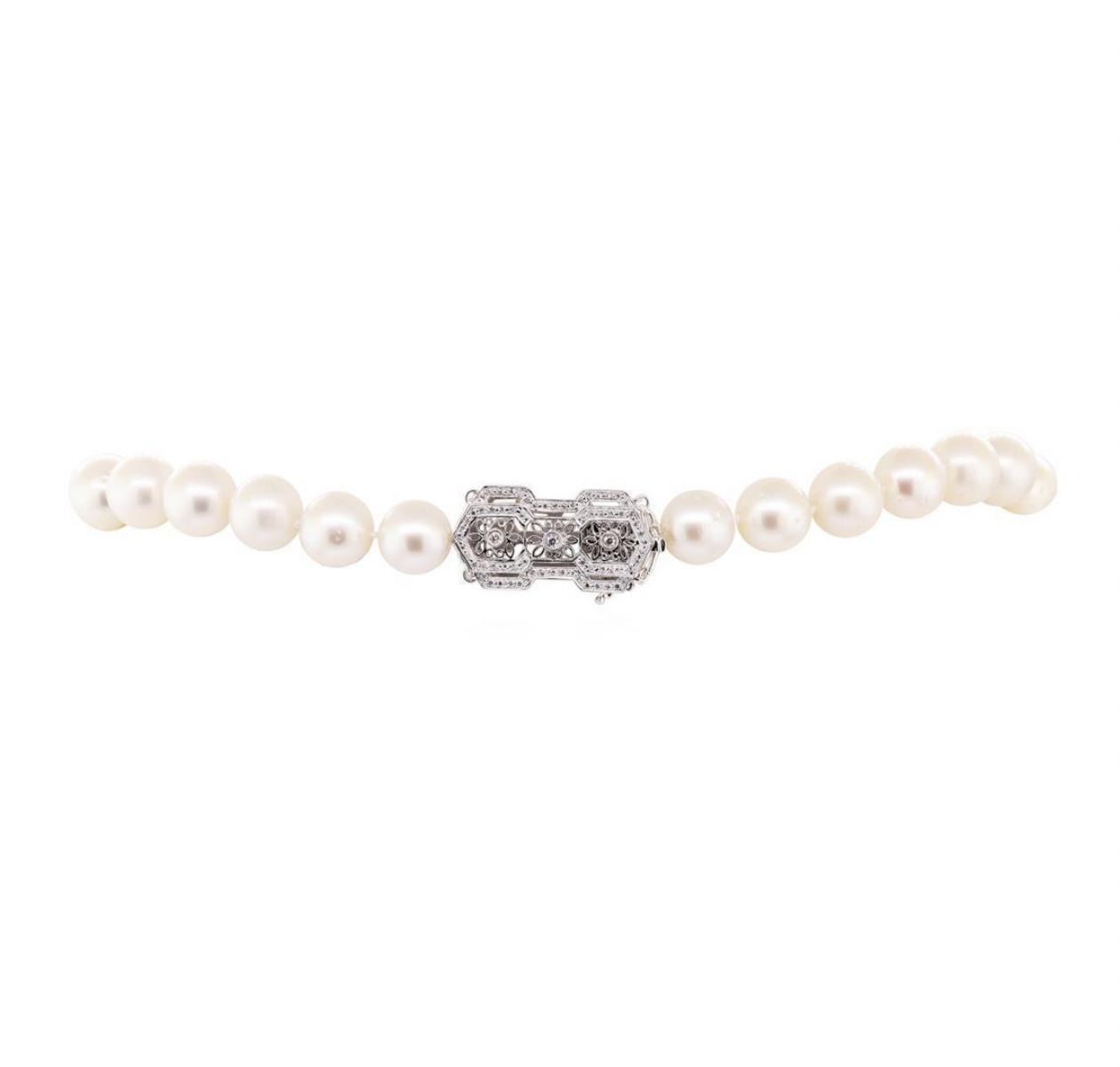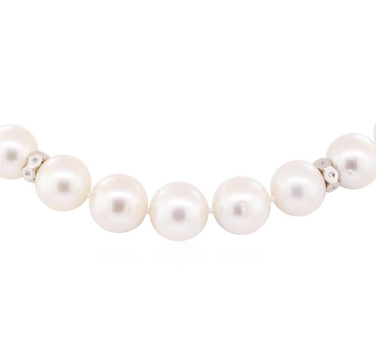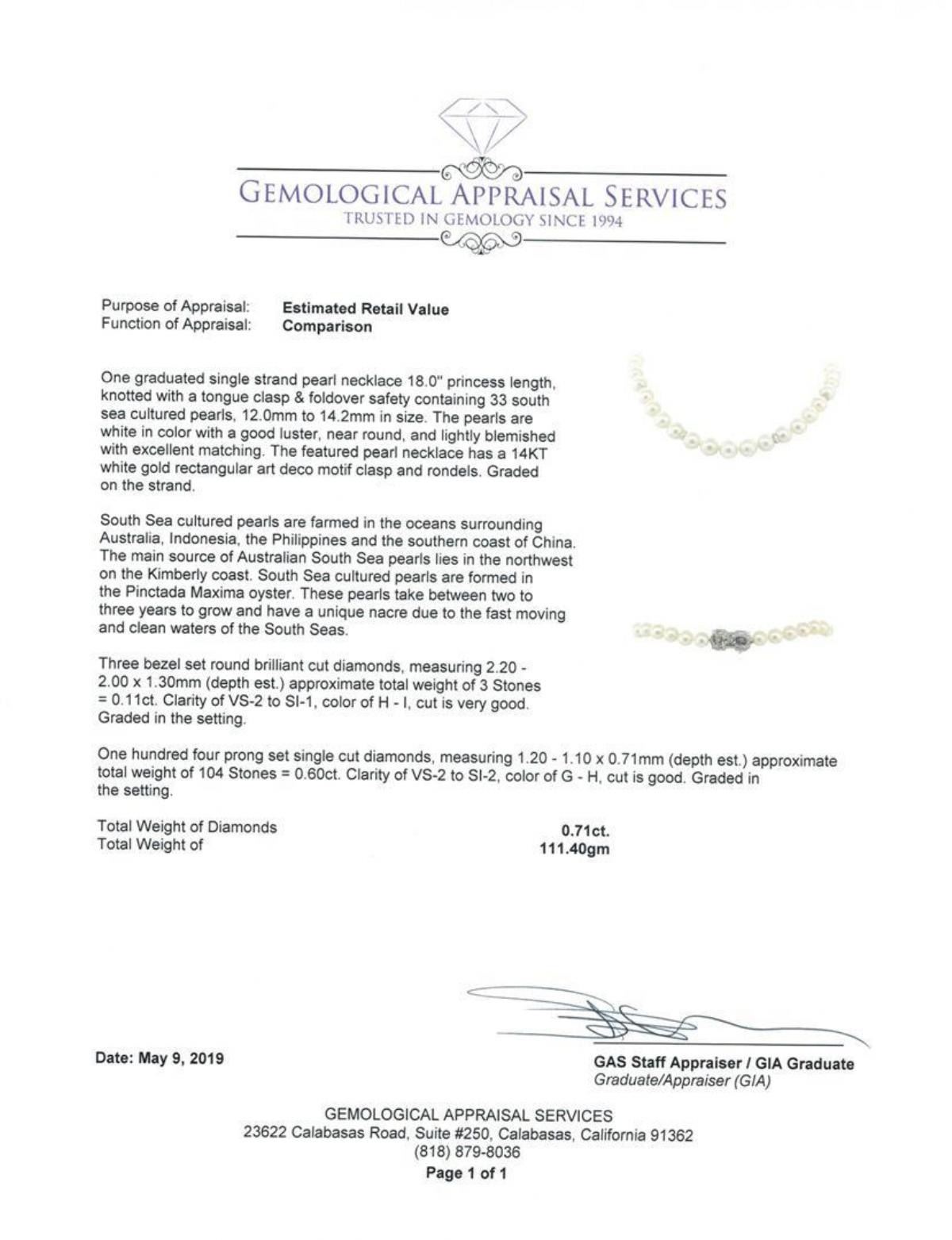 One graduated single strand pearl necklace 18.0' princess length, knotted with a tongue clasp & foldover safety containing 33 south sea cultured pearls, 12.0mm to 14.2mm in size. The pearls are white in color with a good luster, near round, and lightly blemished with excellent matching. The featured pearl necklace has a 14KT white gold rectangular art deco motif clasp and rondels. Graded on the strand.South Sea cultured pearls are farmed in the oceans surrounding Australia, Indonesia, the Philippines and the southern coast of China. The main source of Australian South Sea pearls lies in the northwest on the Kimberly coast. South Sea cultured pearls are formed in the Pinctada Maxima oyster. These pearls take between two to three years to grow and have a unique nacre due to the fast moving and clean waters of the South Seas. Three bezel set round brilliant cut diamonds, measuring 2.20 - 2.00 x 1.30mm (depth est.) approximate total weight of 3 Stones = 0.11ct. Graded in the setting. Color H - I Clarity VS-2 to SI-1 Cut Very Good One Hundred Four prong set single cut diamonds, measuring 1.20 - 1.10 x 0.71mm (depth est.) approximate total weight of 104 Stones = 0.60ct. Graded in the setting. Color G - H Clarity VS-2 to SI-2 Cut Good. Total Weight of Diamonds 0.71ct.. Total Weight of 111.40gm GAS Appraised at $22730.00. GAS Appraised.