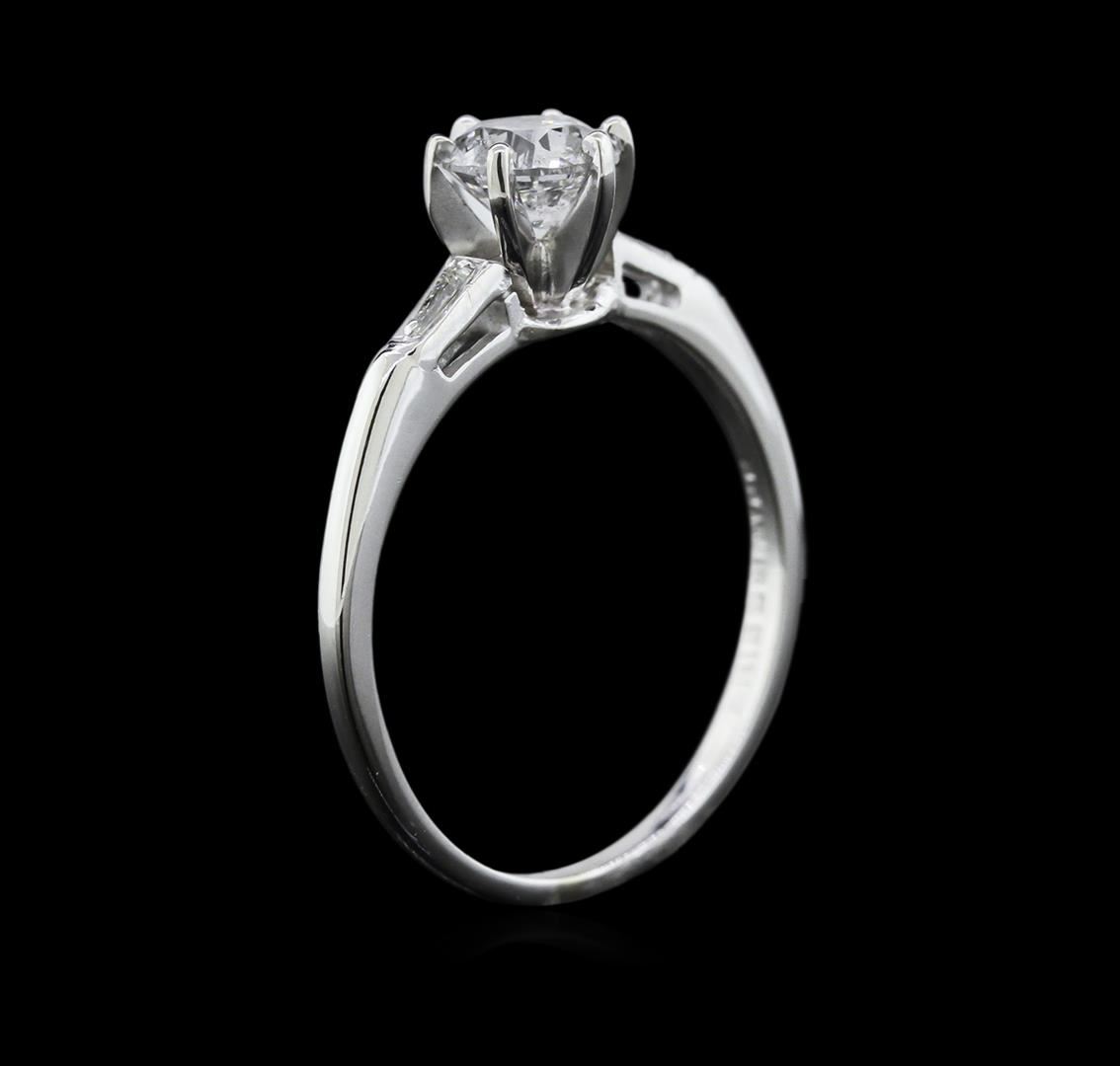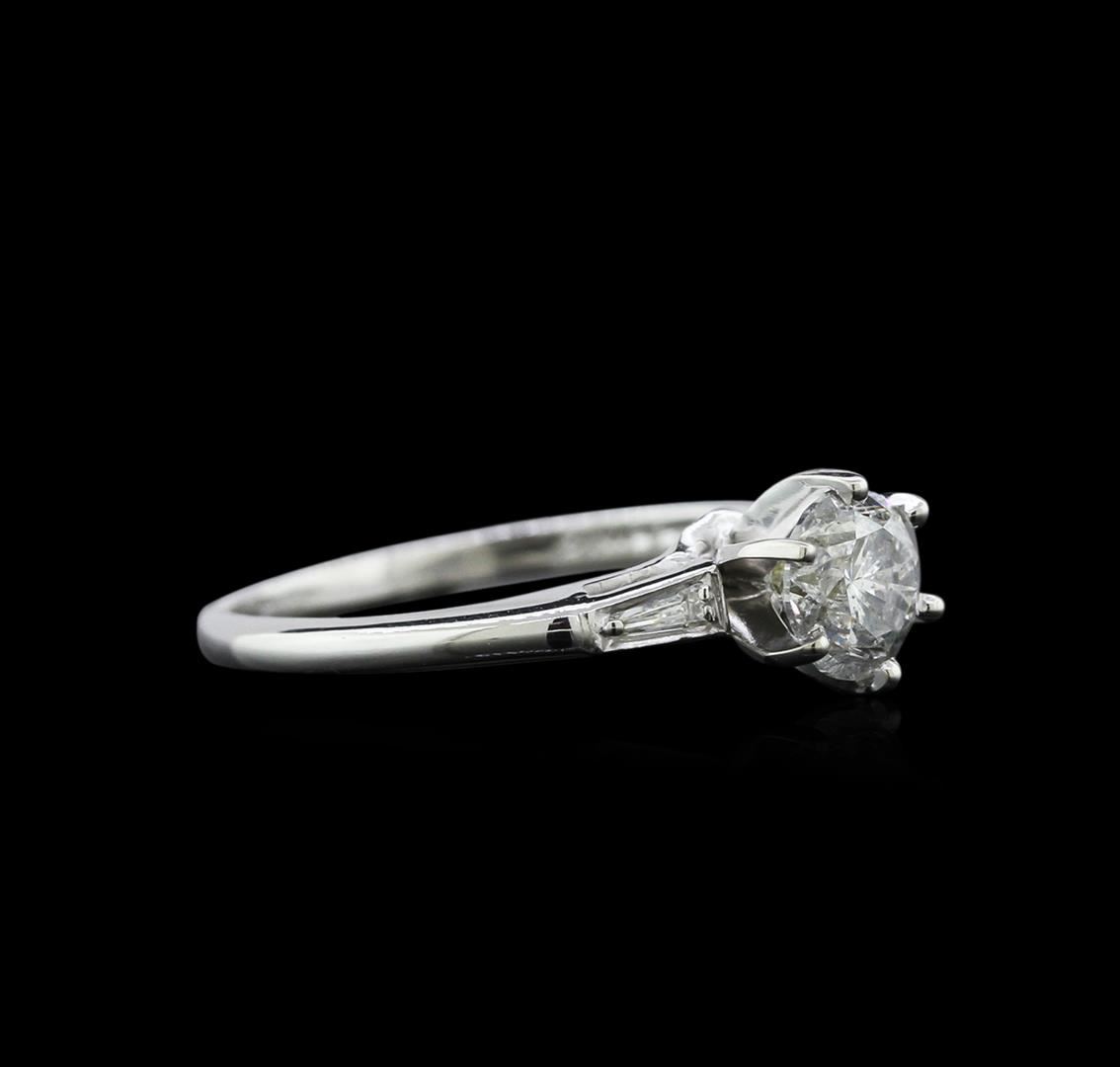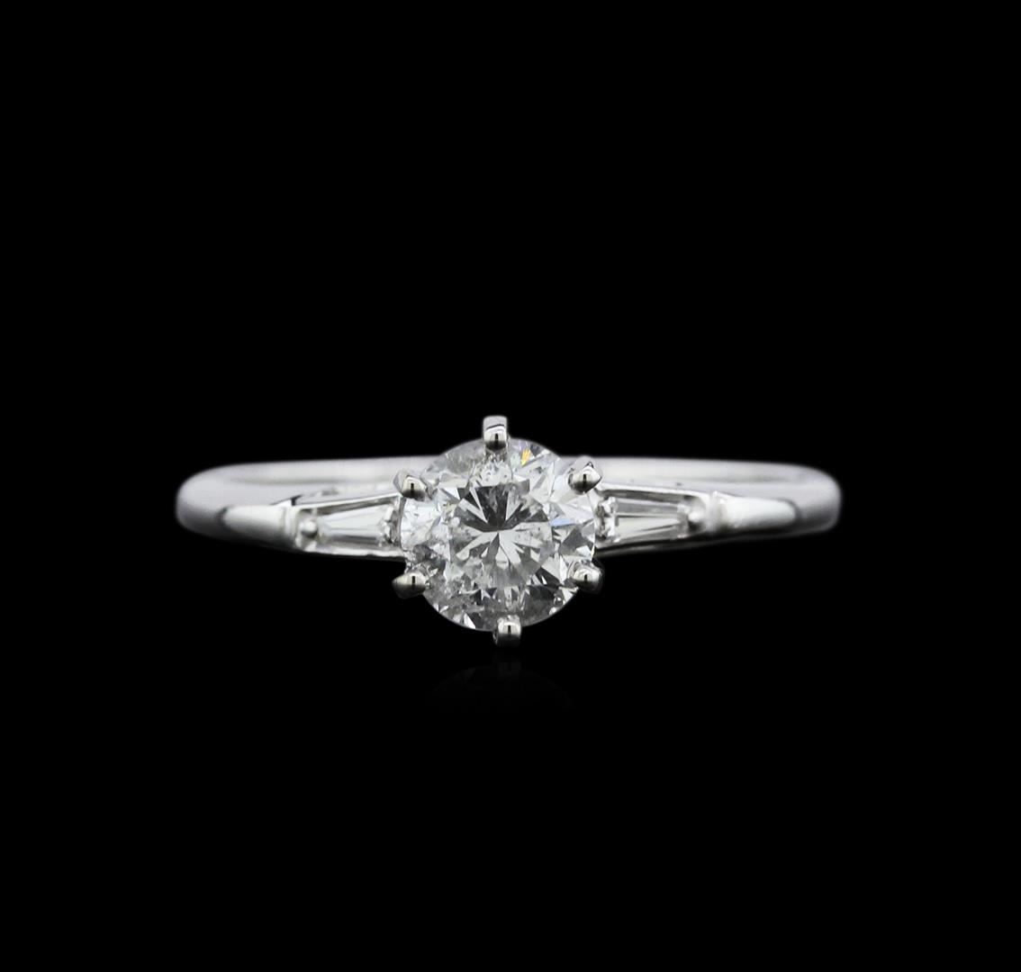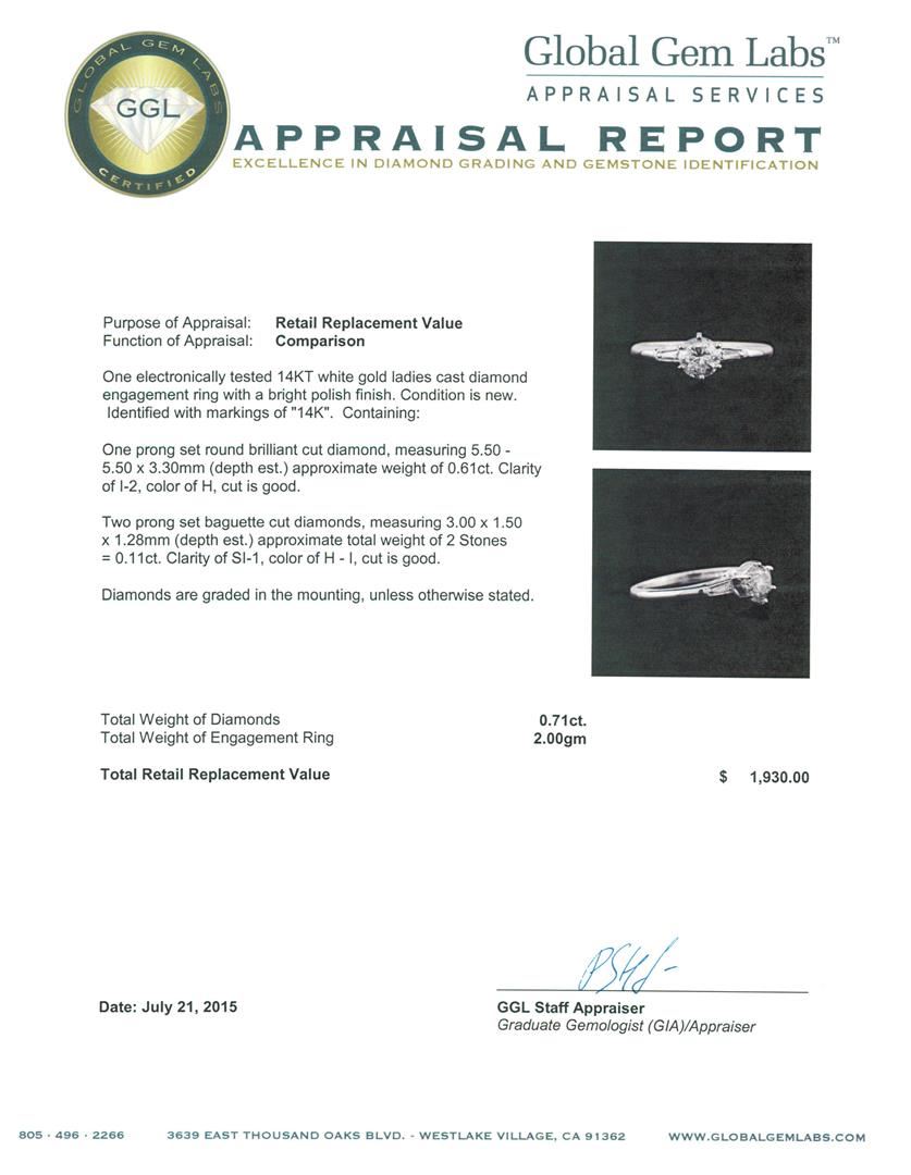 One electronically tested 14KT white gold ladies cast diamond engagement ring with a bright polish finish. Identified with markings of "14K". Condition is new. Containing: One prong set round brilliant cut diamond, measuring 5.50 - 5.50 x 3.30mm (depth est.) approximate weight of 0.61ct. Clarity: I-2. Color: H, Cut is Good. Two prong set baguette cut diamonds, measuring 3.00 x 1.50 x 1.28mm (depth est.) approximate total weight of 2 Stones = 0.11ct. Clarity: SI-1. Color: H - I, Cut is Good. Diamonds are graded in the mounting, unless otherwise stated. Total Weight of Diamonds 0.71ct. Total Weight of Engagement Ring 2.00gm. GGL Appraised at $1,930.00.