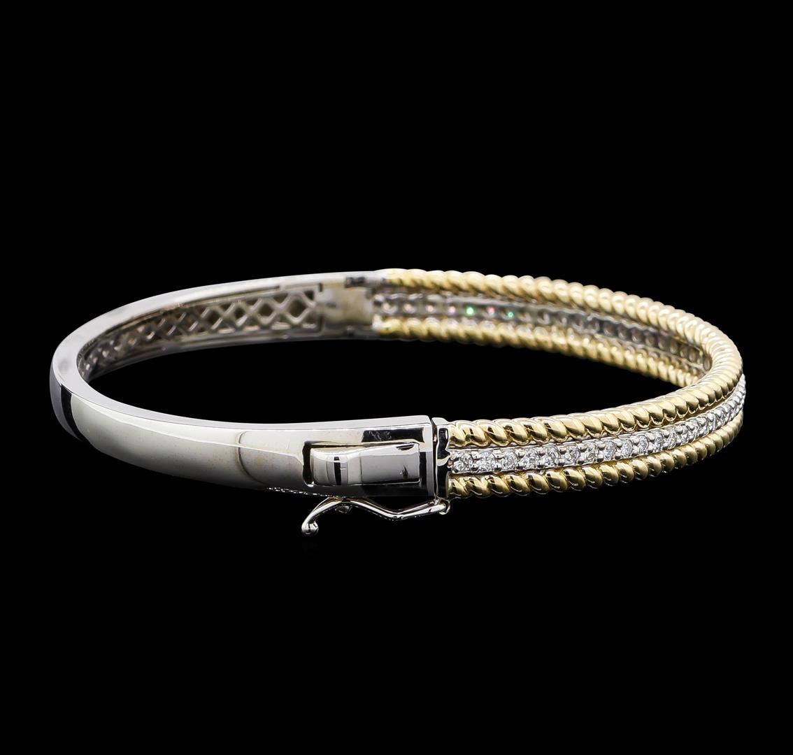 One electronically tested 14KT white and yellow gold lady's combination cast & assembled fashion bangle bracelet with a tongue clasp with foldover safety with a bright polish finish. The featured lady's bracelet has a single row of diamonds framed by a yellow gold twisted wire motif and measures approximately 7.25 inches in length. Identified with markings of 'K14'. Condition is new, good workmanship. Containing: Fifty prong set round brilliant cut diamonds, measuring 1.60 - 1.55 x 0.96mm (depth est.) approximate total weight of 50 Stones = 0.72ct. Graded in the setting. Clarity SI-1 to SI-2. Color: H - I Cut Good. Total Weight of Diamonds 0.72ct.. Total Weight of Bangle Bracelet 19.10gm. GAS Appraised at $5,055.00.